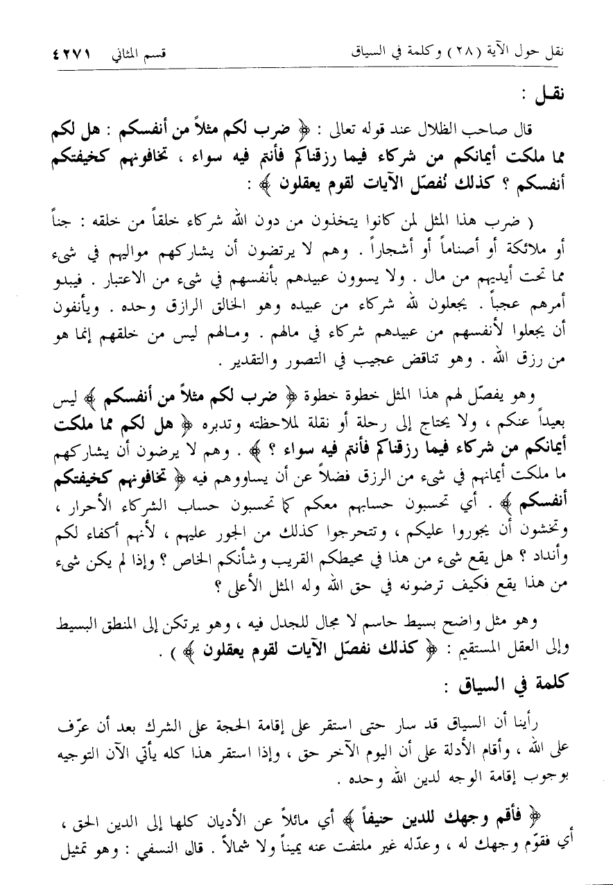 قال صاحب الظلال عند قوله تعالى: ضَرَبَ لَكُمْ مَثَلًا مِنْ أَنْفُسِكُمْ: هَلْ لَكُمْ مِنْ ما مَلَكَتْ أَيْمانُكُمْ مِنْ شُرَكاءَ فِي ما رَزَقْناكُمْ فَأَنْتُمْ فِيهِ سَواءٌ، تَخافُونَهُمْ كَخِيفَتِكُمْ أَنْفُسَكُمْ؟ كَذلِكَ نُفَصِّلُ الْآياتِ لِقَوْمٍ يَعْقِلُونَ: