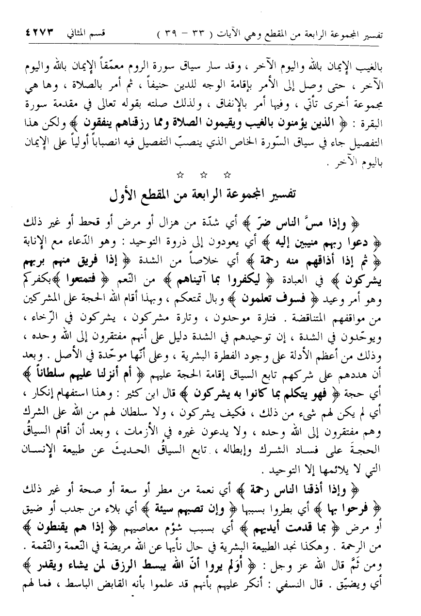 وَإِذا مَسَّ النَّاسَ ضُرٌّ أي شدّة من هزال أو مرض أو قحط أو غير ذلك دَعَوْا رَبَّهُمْ مُنِيبِينَ إِلَيْهِ أي يعودون إلى ذروة التوحيد: وهو الدّعاء مع الإنابة ثُمَّ إِذا أَذاقَهُمْ مِنْهُ رَحْمَةً أي خلاصا من الشدة إِذا فَرِيقٌ مِنْهُمْ بِرَبِّهِمْ يُشْرِكُونَ في العبادة