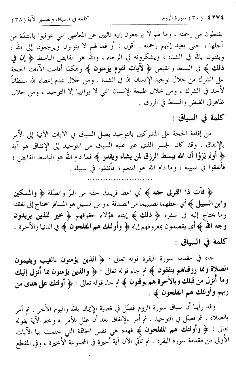 وقد رأينا أن سياق سورة الروم فصّل في قضية الإيمان بالله واليوم الآخر. ثم أمر بالصلاة. ثم فصّل في التوحيد. ثم أمر بالإنفاق بعد أن علل للأمر به وختم الآية بقوله تعالى: وَأُولئِكَ هُمُ الْمُفْلِحُونَ فهذه هي نفس الخاتمة التي ختمت بها الآيات الأولى من مقدمة سورة البقرة. ثم تأتي الآن آية أخيرة في المجموعة الأخيرة، وفي المقطع