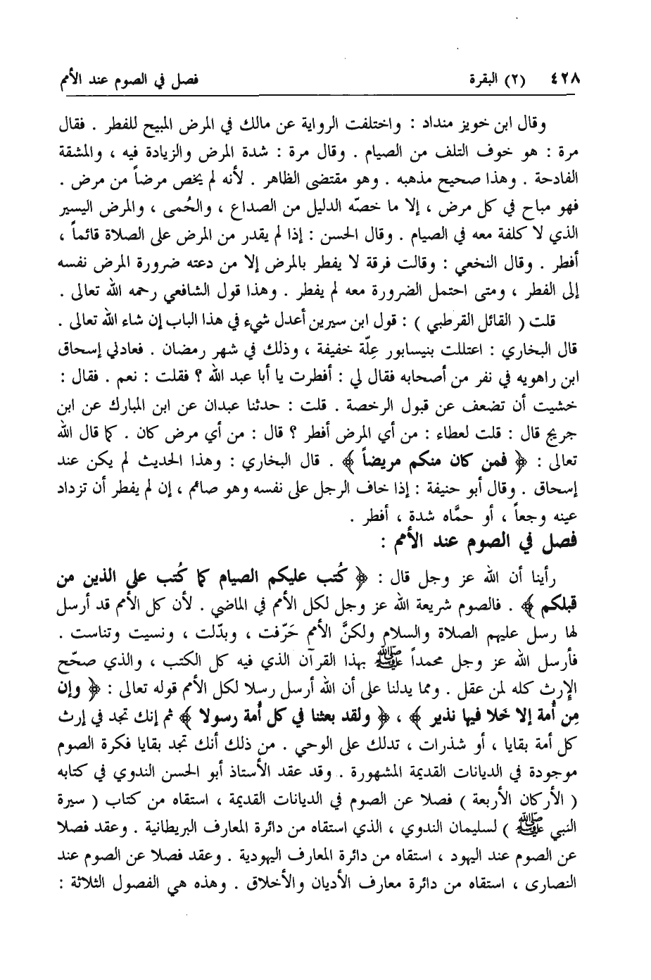 فأرسل الله عزّ وجل محمدا صلى الله عليه وسلم بهذا القرآن الذي فيه كل الكتب، والذي صحح الإرث كله لمن عقل. ومما يدلنا على أن الله أرسل رسلا لكل الأمم قوله تعالى: وَإِنْ مِنْ أُمَّةٍ إِلَّا خَلا فِيها نَذِيرٌ، وَلَقَدْ بَعَثْنا فِي كُلِّ أُمَّةٍ رَسُولًا ثم إنك تجد في إرث كل أمة بقايا، أو شذرات، تدلك على الوحي. من ذلك أنك تجد بقايا فكرة الصوم موجودة في الديانات القديمة المشهورة. وقد عقد الأستاذ أبو الحسن الندوي في كتابه (الأركان الأربعة) فصلا عن الصوم في الديانات القديمة، استقاه من كتاب (سيرة النبي صلى الله عليه وسلم) لسليمان الندوي، الذي استقاه من دائرة المعارف البريطانية. وعقد فصلا عن الصوم عند اليهود، استقاه من دائرة المعارف اليهودية. وعقد فصلا عن الصوم عند النصارى، استقاه من دائرة معارف الأديان والأخلاق. وهذه هي الفصول الثلاثة: