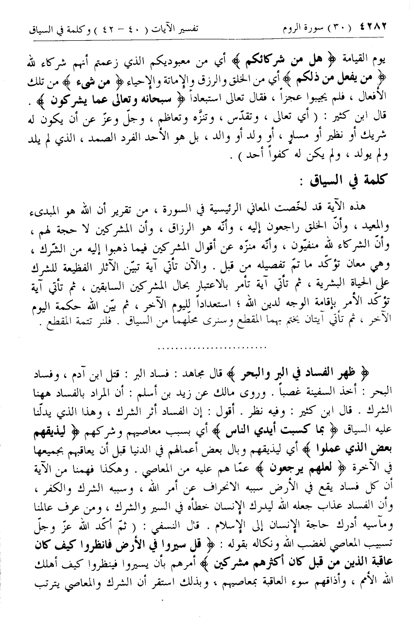 ظَهَرَ الْفَسادُ فِي الْبَرِّ وَالْبَحْرِ قال مجاهد: فساد البر: قتل ابن آدم، وفساد البحر: أخذ السفينة غصبا. وروى مالك عن زيد بن أسلم: أن المراد بالفساد هاهنا الشرك. قال ابن كثير: وفيه نظر. أقول: إن الفساد أثر الشرك، وهذا الذي يدلّنا عليه السياق بِما كَسَبَتْ أَيْدِي النَّاسِ أي بسبب معاصيهم وشركهم لِيُذِيقَهُمْ بَعْضَ الَّذِي عَمِلُوا أي ليذيقهم وبال بعض أعمالهم في الدنيا قبل أن يعاقبهم بجميعها في الآخرة لَعَلَّهُمْ يَرْجِعُونَ عمّا هم عليه من المعاصي. وهكذا فهمنا من الآية أن كل فساد يقع في الأرض سببه الانحراف عن أمر الله، وسببه الشرك والكفر، وأن الفساد عذاب جعله الله ليدرك الإنسان خطأه في السير والشرك، ومن عرف عالمنا ومآسيه أدرك حاجة الإنسان إلى الإسلام.