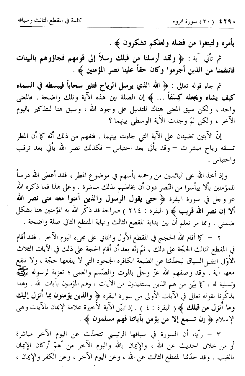 2 - كما أقام الله الحجج في المقطع الأول والثاني على مجئ اليوم الآخر. فقد أقام في المقطع الثالث الحجّة على ذلك، ثمّ إنّه بعد أن أقام الحجة على ذلك في الآيات الثلاث الأول انتقل السياق ليحدّثنا عن الطبيعة الكافرة الجحود التي لا ينفعها حجّة، ولا تنفع معها آية. وقد وصفهم الله عزّ وجلّ بالموت والصّمم والعمى؛ تعزية لرسوله صلّى الله عليه وسلم وتسلية له، كما بيّن من هم الذين يستفيدون من الآيات، وهم المؤمنون بآيات الله. وهذا يذكّرنا بقوله تعالى في الآيات الأولى من سورة البقرة وَالَّذِينَ يُؤْمِنُونَ بِما أُنْزِلَ إِلَيْكَ وَما أُنْزِلَ مِنْ قَبْلِكَ (البقرة: 4). إذ تبيّن الآية الأخيرة علامة الإيمان بالآيات وهي الإسلام إِنْ تُسْمِعُ إِلَّا مَنْ يُؤْمِنُ بِآياتِنا فَهُمْ مُسْلِمُونَ.