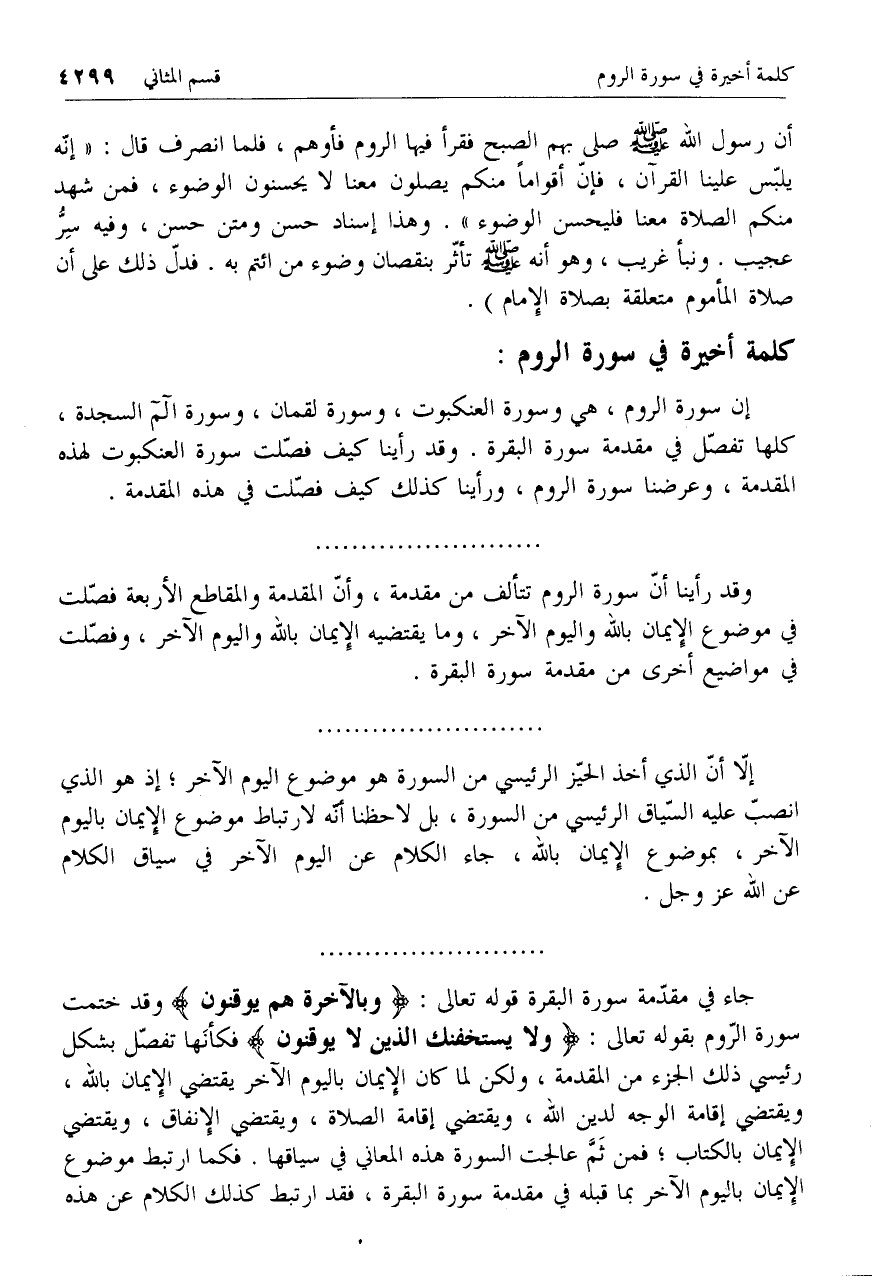 وقد رأينا أنّ سورة الروم تتألف من مقدمة، وأنّ المقدمة والمقاطع الأربعة فصّلت في موضوع الإيمان بالله واليوم الآخر، وما يقتضيه الإيمان بالله واليوم الآخر، وفصّلت في مواضيع أخرى من مقدمة سورة البقرة.