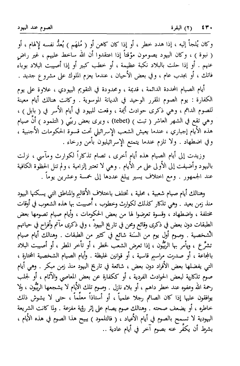 وهنالك أيام صيام شعبية، محلية، تختلف باختلاف الأقاليم والمناطق التي يسكنها اليهود منذ زمن بعيد. وهي تذكار كذلك لكوارث وخطوب، أصيبت بها هذه الشعوب في أوقات مختلفة، واضطهاد، وقسوة تعرضوا لها من بعض الحكومات، وأيام صيام تصومها بعض الطبقات دون بعض في ذكرى وقائع ومحن في تاريخ اليهود، وفي ذكرى مآتم وأفراح في حياتهم الشخصية. وصوم أول يوم من السنة شائع في كثير من الطبقات. وهنالك أيام صيام تشرع، ويأمر بها الربيون، إذا تعرض الشعب لخطر، أو تأخر المطر، أو أصيبت البلاد بالمجاعة، أو صدرت مراسيم قاسية، أو قوانين غليظة. وأيام الصيام الشخصية المختارة، التي يفضلها بعض الأفراد دون بعض، شائعة في تاريخ اليهود منذ زمن مبكر. وهي أيام صوم تذكارية لبعض الحوادث الفردية، أو ككفارة عن بعض المعاصي والآثام، أو لجلب رحمة الله وعفوه عند خطر داهم، أو بلاء نازل. وصوم تلك الأيام لا يشجعها الربيون، ولا يوافقون عليها إذا كان الصائم رجلا علميا، أو أستاذا معلما، حتى لا يشوش ذلك خاطره، أو يضعف صحته. وهنالك صوم يصام على إثر رؤية مفزعة. ولما كانت الشريعة اليهودية لا تسمح بالصوم في أيام الأعياد، (فالتلمود) يبيح هذا الصوم في هذه الأيام، بشرط أن يكفر عنه بصوم آخر في أيام عادية ..
