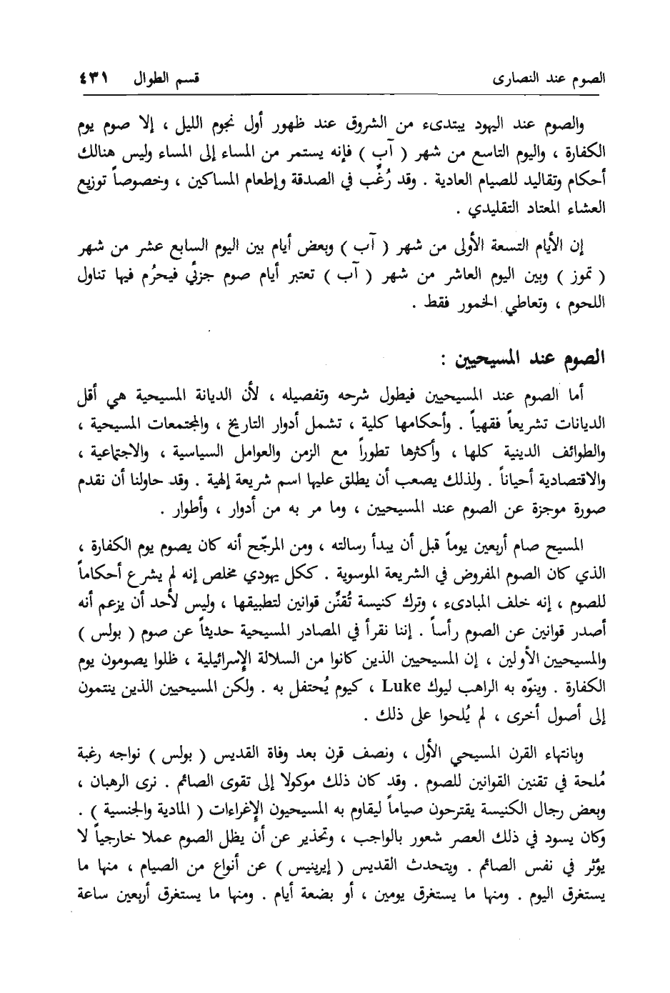 أما الصوم عند المسيحيين فيطول شرحه وتفصيله، لأن الديانة المسيحية هي أقل الديانات تشريعا فقهيا. وأحكامها كلية، تشمل أدوار التاريخ، والمجتمعات المسيحية، والطوائف الدينية كلها، وأكثرها تطورا مع الزمن والعوامل السياسية، والاجتماعية، والاقتصادية أحيانا. ولذلك يصعب أن يطلق عليها اسم شريعة إلهية. وقد حاولنا أن نقدم صورة موجزة عن الصوم عند المسيحيين، وما مر به من أدوار، وأطوار.
