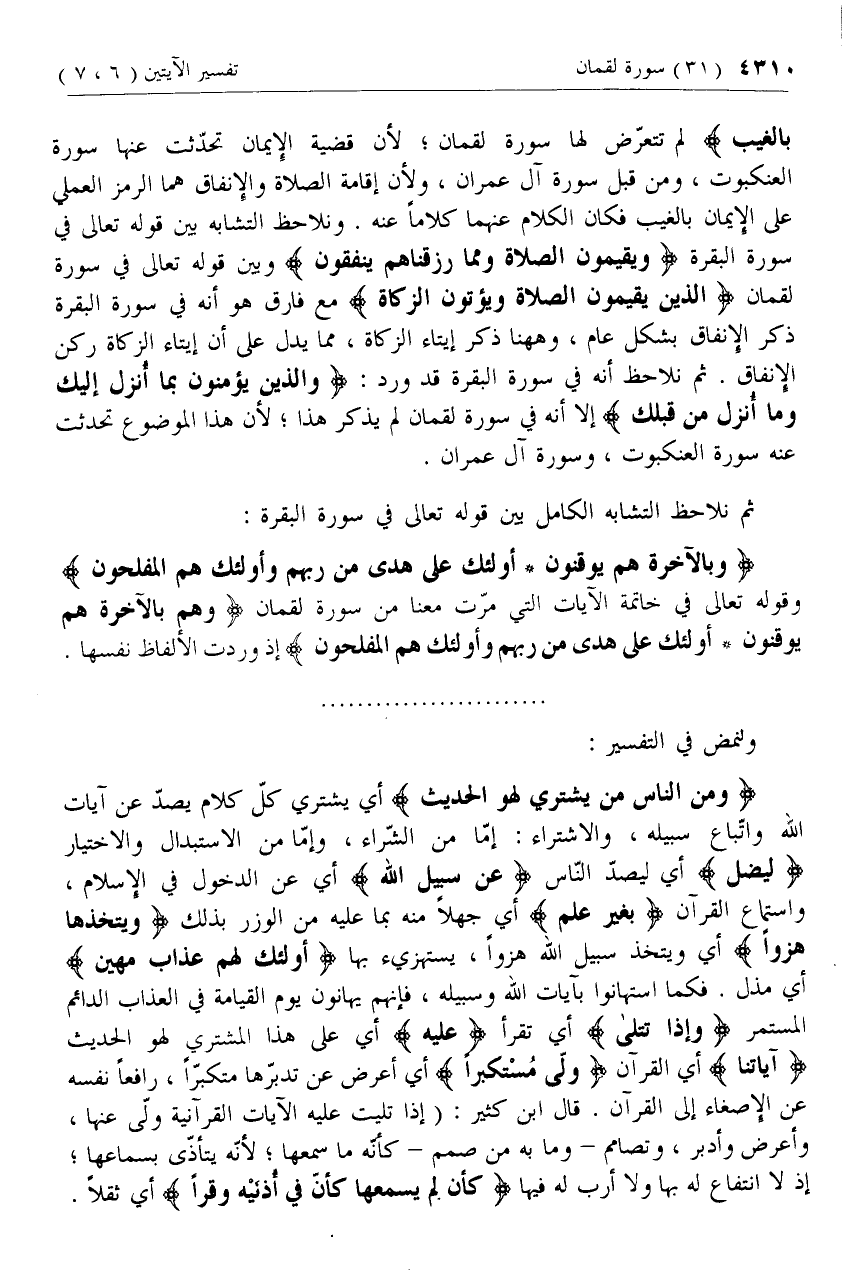 وَبِالْآخِرَةِ هُمْ يُوقِنُونَ* أُولئِكَ عَلى هُدىً مِنْ رَبِّهِمْ وَأُولئِكَ هُمُ الْمُفْلِحُونَ وقوله تعالى في خاتمة الآيات التي مرّت معنا من سورة لقمان وَهُمْ بِالْآخِرَةِ هُمْ يُوقِنُونَ* أُولئِكَ عَلى هُدىً مِنْ رَبِّهِمْ وَأُولئِكَ هُمُ الْمُفْلِحُونَ إذ وردت الألفاظ نفسها.