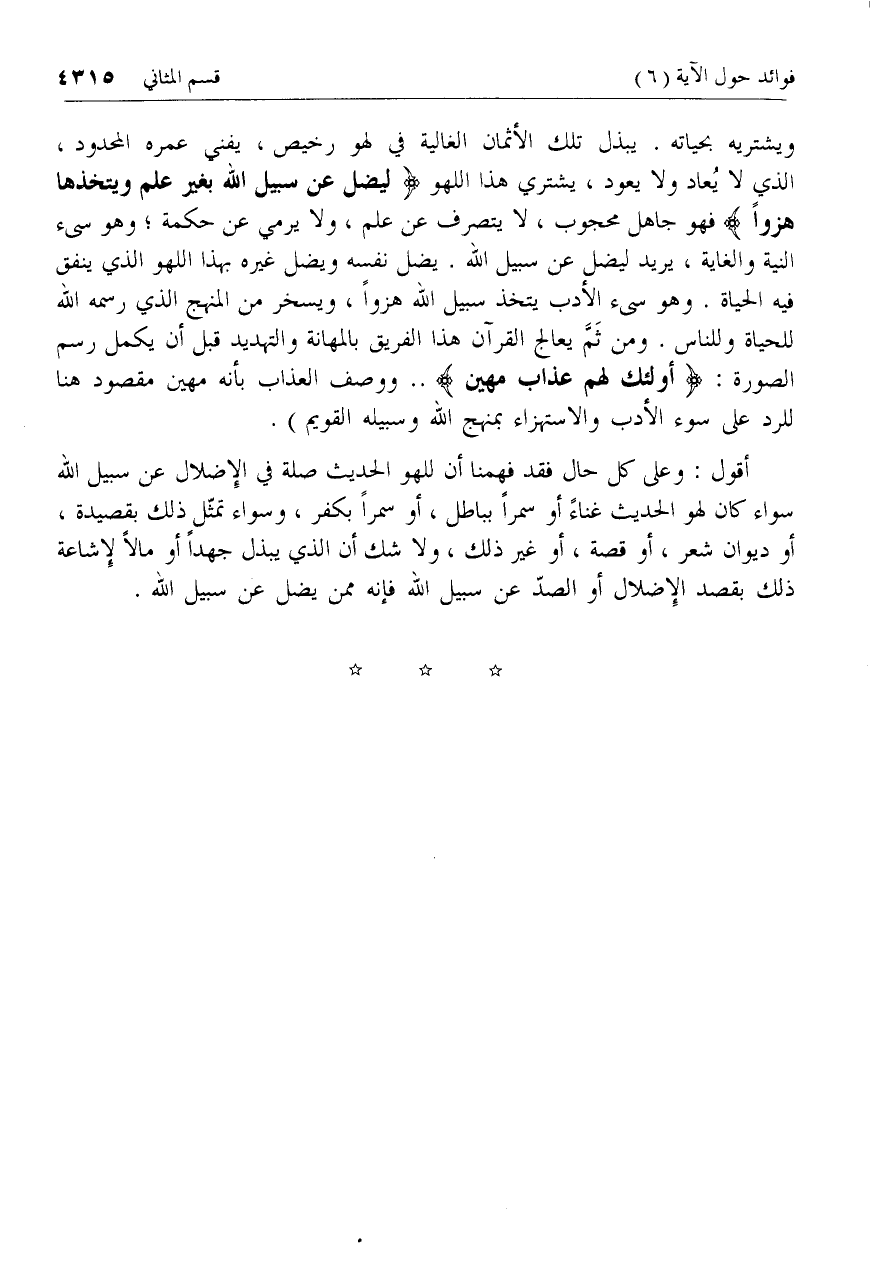 ويشتريه بحياته. يبذل تلك الأثمان الغالية في لهو رخيص، يفني عمره المحدود، الذي لا يعاد ولا يعود، يشتري هذا اللهو لِيُضِلَّ عَنْ سَبِيلِ اللَّهِ بِغَيْرِ عِلْمٍ وَيَتَّخِذَها هُزُواً فهو جاهل محجوب، لا يتصرف عن علم، ولا يرمي عن حكمة؛ وهو سيئ النية والغاية، يريد ليضل عن سبيل الله. يضل نفسه ويضل غيره بهذا اللهو الذي ينفق فيه الحياة. وهو سيئ الأدب يتخذ سبيل الله هزوا، ويسخر من المنهج الذي رسمه الله للحياة وللناس. ومن ثمّ يعالج القرآن هذا الفريق بالمهانة والتهديد قبل أن يكمل رسم الصورة: أُولئِكَ لَهُمْ عَذابٌ مُهِينٌ .. ووصف العذاب بأنه مهين مقصود هنا للرد على سوء الأدب والاستهزاء بمنهج الله وسبيله القويم).