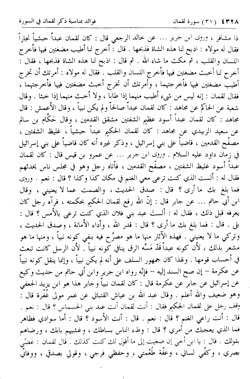 أخرج لنا أخبث مضغتين فيها فأخرج اللسان والقلب. فقال له مولاه: أمرتك أن تخرج أطيب مضغتين فيها فأخرجتهما، وأمرتك أن تخرج أخبث مضغتين فيها فأخرجتهما، فقال لقمان: إنه ليس من شئ أطيب منهما إذا طابا، ولا أخبث منهما إذا خبثا. وقال شعبة عن الحاكم عن مجاهد: كان لقمان عبدا صالحا ولم يكن نبيا، وقال الأعمش: قال مجاهد: كان لقمان عبدا أسود عظيم الشفتين مشقق القدمين، وقال حكّام بن سالم عن سعيد الزبيدي عن مجاهد: كان لقمان الحكيم عبدا حبشيا، غليظ الشفتين، مصفّح القدمين، قاضيا على بني إسرائيل، وذكر غيره أنه كان قاضيا على بني إسرائيل في زمان داود عليه السلام. وروى ابن جرير ... عن عمرو بن قيس قال: كان لقمان عبدا أسود غليظ الشفتين، مصفّح القدمين، فأتاه رجل وهو في مجلس ناس يحدثهم فقال له: ألست الذي كنت ترعى معي الغنم في مكان كذا وكذا؟ قال: نعم. وروى فما بلغ بك ما أرى؟ قال: صدق الحديث، والصمت عما لا يعنيني، وقال ابن أبي حاتم ... عن جابر قال: إنّ الله رفع لقمان الحكيم بحكمته، فرآه رجل كان يعرفه قبل ذلك، فقال له: ألست عبد بني فلان الذي كنت ترعى بالأمس؟ قال:
