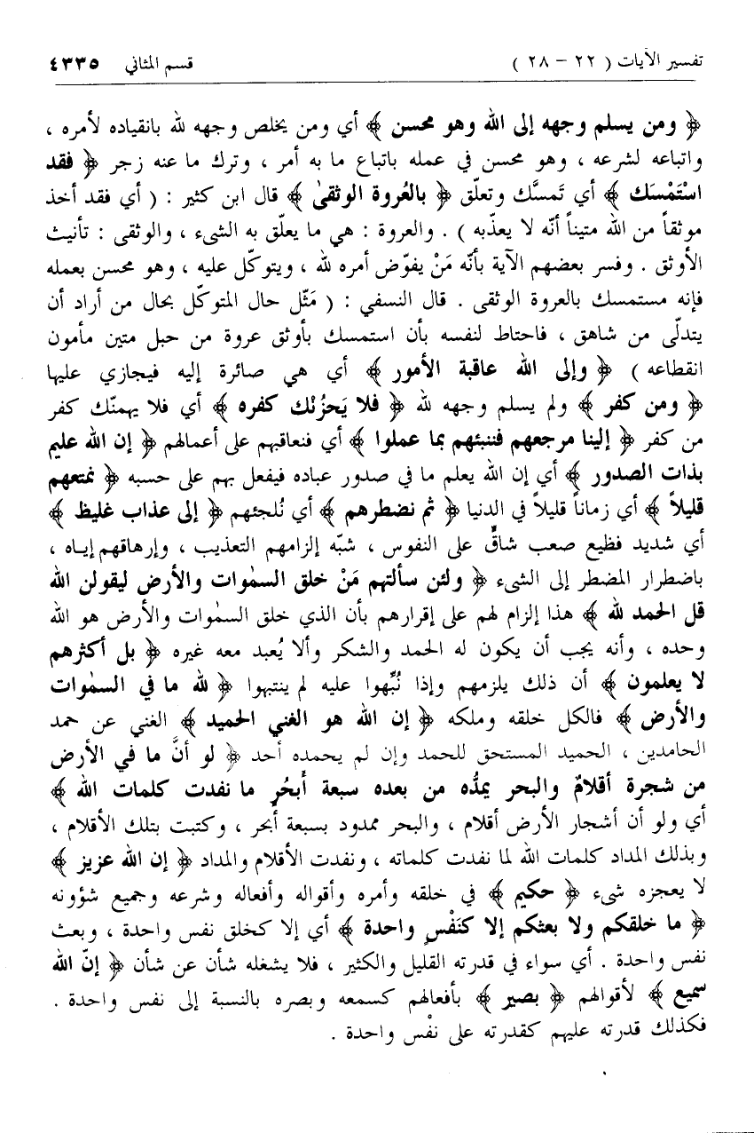 وَمَنْ يُسْلِمْ وَجْهَهُ إِلَى اللَّهِ وَهُوَ مُحْسِنٌ أي ومن يخلص وجهه لله بانقياده لأمره، واتباعه لشرعه، وهو محسن في عمله باتباع ما به أمر، وترك ما عنه زجر فَقَدِ اسْتَمْسَكَ أي تمسّك وتعلّق بِالْعُرْوَةِ الْوُثْقى قال ابن كثير: (أي فقد أخذ موثقا من الله متينا أنّه لا يعذّبه). والعروة: هي ما يعلّق به الشئ، والوثقى: تأنيث الأوثق. وفسر بعضهم الآية بأنّه من يفوّض أمره لله، ويتوكّل عليه، وهو محسن بعمله فإنه مستمسك بالعروة الوثقى. قال النسفي: (مثّل حال المتوكّل بحال من أراد أن يتدلّى من شاهق، فاحتاط لنفسه بأن استمسك بأوثق عروة من حبل متين مأمون انقطاعه) وَإِلَى اللَّهِ عاقِبَةُ الْأُمُورِ أي هي صائرة إليه فيجازي عليها