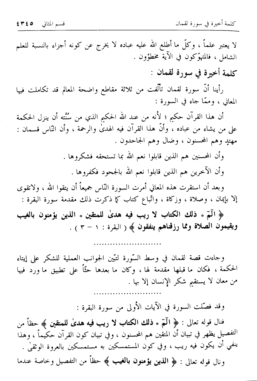 فنال قوله تعالى: الم* ذلِكَ الْكِتابُ لا رَيْبَ فِيهِ هُدىً لِلْمُتَّقِينَ حظا من التفصيل يظهر في تبيان أن المتقين هم المحسنون، وفي تبيان كون القرآن حكيما، وهذا ينفي أن يكون فيه ريب، وفي كون المستمسكين به مستمسكين بالعروة الوثقى.