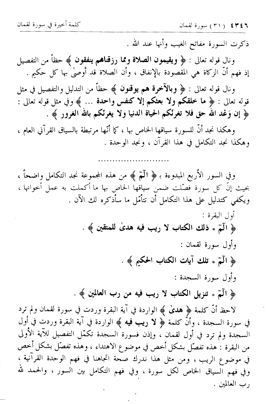 لاحظ أنّ كلمة هُدىً الواردة في آية البقرة وردت في سورة لقمان ولم ترد في سورة السجدة، وأنّ كلمة لا رَيْبَ فِيهِ الواردة في آية البقرة وردت في أول السجدة ولم ترد في أول لقمان، وإذن فسورة السجدة تكمّل التفصيل للآية الأولى من البقرة: هذه تفصّل بشكل أخص في موضوع الاهتداء، وهذه تفصّل بشكل أخص في موضوع الريب، ومن مثل هذا ندرك صحة اتجاهنا في فهم الوحدة القرآنية، وفي فهم السياق الخاص لكل سورة، وفي فهم التكامل بين السور، والحمد لله رب العالمين.