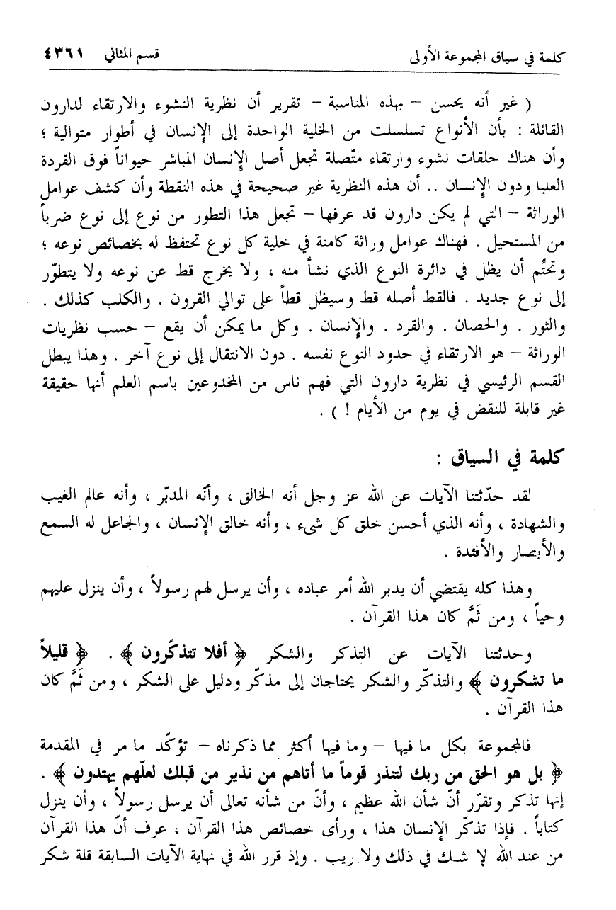 (غير أنه يحسن- بهذه المناسبة- تقرير أن نظرية النشوء والارتقاء لدارون القائلة: بأن الأنواع تسلسلت من الخلية الواحدة إلى الإنسان في أطوار متوالية؛ وأن هناك حلقات نشوء وارتقاء متّصلة تجعل أصل الإنسان المباشر حيوانا فوق القردة العليا ودون الإنسان .. أن هذه النظرية غير صحيحة في هذه النقطة وأن كشف عوامل الوراثة- التي لم يكن دارون قد عرفها- تجعل هذا التطور من نوع إلى نوع ضربا من المستحيل. فهناك عوامل وراثة كامنة في خلية كل نوع تحتفظ له بخصائص نوعه؛ وتحتّم أن يظل في دائرة النوع الذي نشأ منه، ولا يخرج قط عن نوعه ولا يتطوّر إلى نوع جديد. فالقط أصله قط وسيظل قطا على توالي القرون. والكلب كذلك.