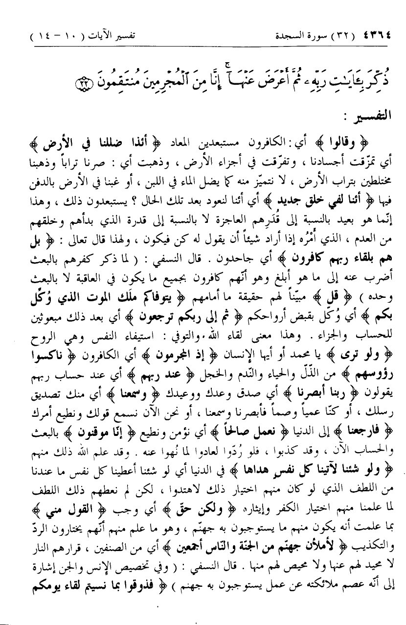 وَقالُوا أي: الكافرون مستبعدين المعاد أَإِذا ضَلَلْنا فِي الْأَرْضِ أي تمزّقت أجسادنا، وتفرّقت في أجزاء الأرض، وذهبت أي: صرنا ترابا وذهبنا مختلطين بتراب الأرض، لا نتميّز منه كما يضل الماء في اللبن، أو غبنا في الأرض بالدفن فيها أَإِنَّا لَفِي خَلْقٍ جَدِيدٍ أي أإنا لنعود بعد تلك الحال؟ يستبعدون ذلك، وهذا إنّما هو بعيد بالنسبة إلى قدرهم العاجزة لا بالنسبة إلى قدرة الذي بدأهم وخلقهم من العدم، الذي أمره إذا أراد شيئا أن يقول له كن فيكون، ولهذا قال تعالى: بَلْ هُمْ بِلِقاءِ رَبِّهِمْ كافِرُونَ أي جاحدون. قال النسفي: (لما ذكر كفرهم بالبعث أضرب عنه إلى ما هو أبلغ وهو أنّهم كافرون بجميع ما يكون في العاقبة لا بالبعث وحده)