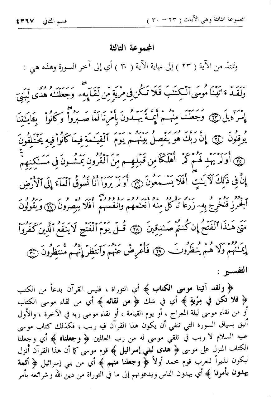 وَلَقَدْ آتَيْنا مُوسَى الْكِتابَ أي التوراة، فليس القرآن بدعا من الكتب فَلا تَكُنْ فِي مِرْيَةٍ أي في شك مِنْ لِقائِهِ أي من لقاء موسى الكتاب أو من لقاء موسى ليلة المعراج، أو يوم القيامة، أو لقاء موسى ربه في الآخرة، والأول أليق بسياق السورة التي تنفي أن يكون هذا القرآن فيه ريب، فكذلك كتاب موسى عليه السلام لا ريب في تلقي موسى له من رب العالمين وَجَعَلْناهُ أي وجعلنا الكتاب المنزل على موسى هُدىً لِبَنِي إِسْرائِيلَ قوم موسى كما أن هذا القرآن أنزل ليكون نذيرا للعرب قوم محمد أولا