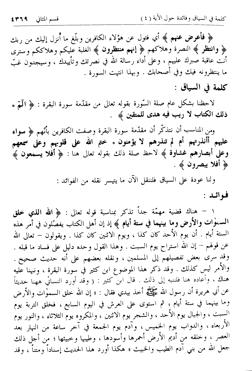 هناك قضية مهمّة جدا تذكر بمناسبة قوله تعالى: اللَّهُ الَّذِي خَلَقَ السَّماواتِ وَالْأَرْضَ وَما بَيْنَهُما فِي سِتَّةِ أَيَّامٍ إذ إن أهل الكتاب يفصّلون في أمر هذه الستة أيام. أن يوم الأحد كان كذا، ويوم الاثنين كان كذا. ويقولون- تعالى الله عن قولهم- إن الله استراح يوم السبت. وهذا القول وحده دليل على فساد ما قبله.