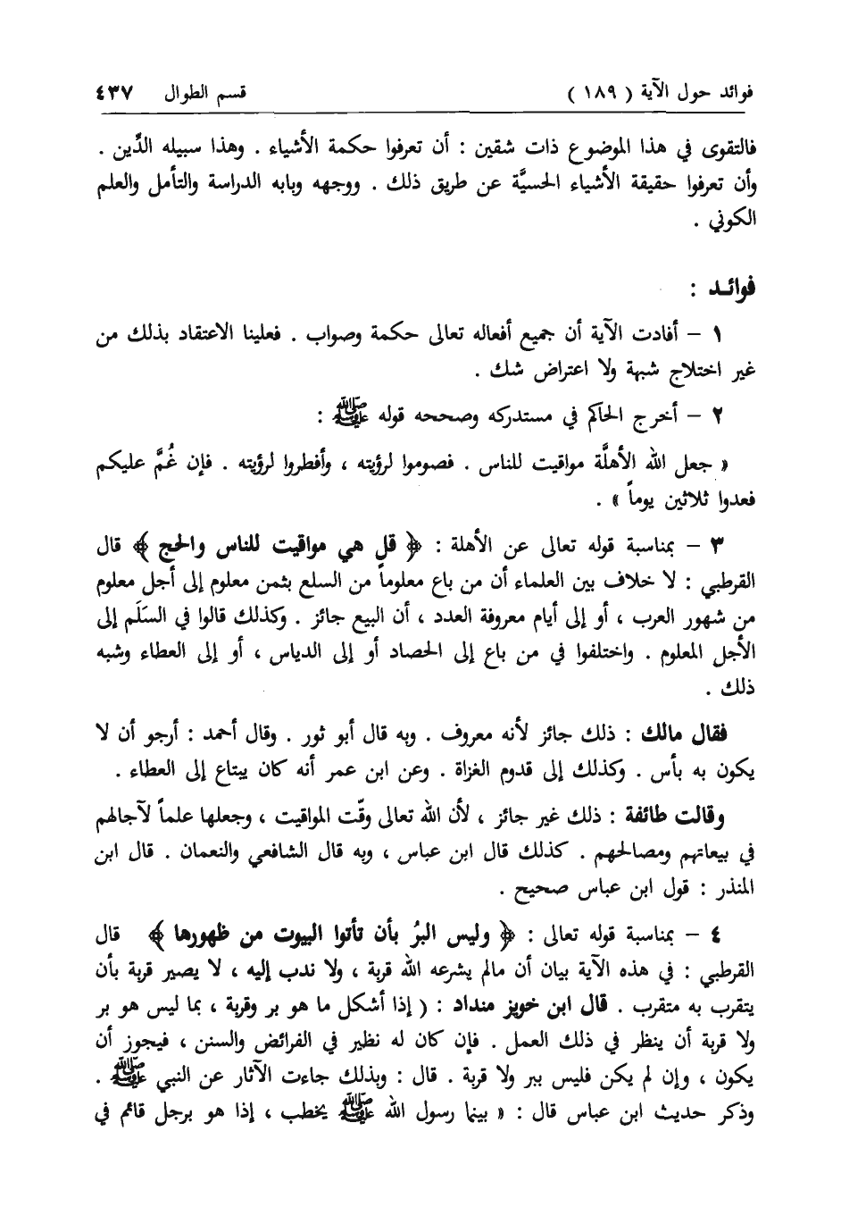 4 - بمناسبة قوله تعالى: وَلَيْسَ الْبِرُّ بِأَنْ تَأْتُوا الْبُيُوتَ مِنْ ظُهُورِها قال القرطبي: في هذه الآية بيان أن ما لم يشرعه الله قربة، ولا ندب إليه، لا يصير قربة بأن يتقرب به متقرب. قال ابن خويزمنداد: (إذا أشكل ما هو بر وقربة، بما ليس هو بر ولا قربة أن ينظر في ذلك العمل. فإن كان له نظير في الفرائض والسنن، فيجوز أن يكون، وإن لم يكن فليس ببر ولا قربة. قال: وبذلك جاءت الآثار عن النبي صلى الله عليه وسلم.