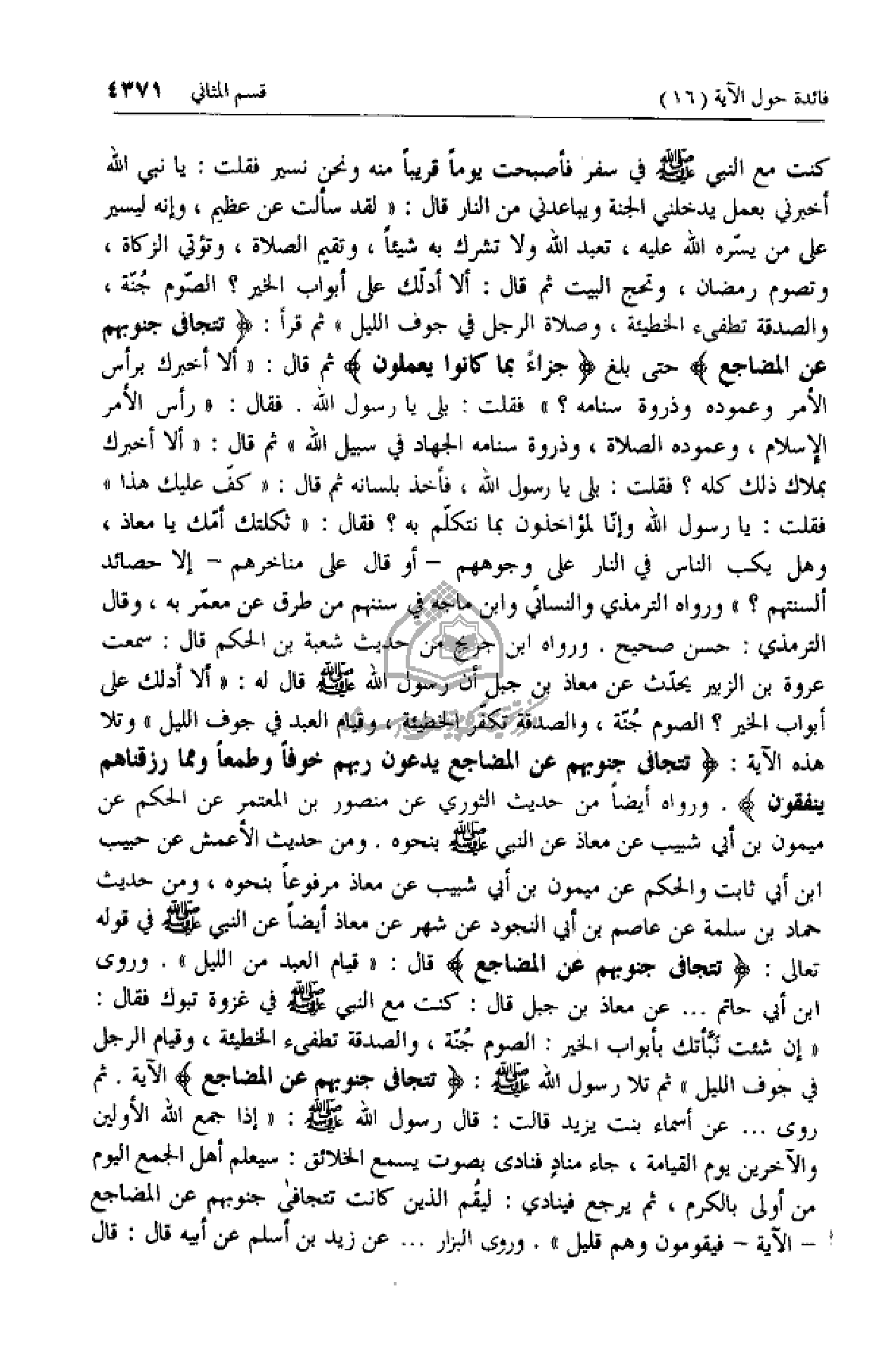 كنت مع النبي صلّى الله عليه وسلم في سفر فأصبحت يوما قريبا منه ونحن نسير فقلت: يا نبي الله أخبرني بعمل يدخلني الجنة ويباعدني من النار قال: «لقد سألت عن عظيم، وإنه ليسير على من يسّره الله عليه، تعبد الله ولا تشرك به شيئا، وتقيم الصلاة، وتؤتي الزكاة، وتصوم رمضان، وتحج البيت ثم قال: ألا أدلّك على أبواب الخير؟ الصّوم جنّة، والصدقة تطفئ الخطيئة، وصلاة الرجل في جوف الليل» ثم قرأ: تَتَجافى جُنُوبُهُمْ عَنِ الْمَضاجِعِ حتى بلغ جَزاءً بِما كانُوا يَعْمَلُونَ ثم قال: «ألا أخبرك برأس الأمر وعموده وذروة سنامه؟» فقلت: بلى يا رسول الله. فقال: «رأس الأمر الإسلام، وعموده الصلاة، وذروة سنامه الجهاد في سبيل الله» ثم قال: «ألا أخبرك بملاك ذلك كله؟ فقلت: بلى يا رسول الله، فأخذ بلسانه ثم قال: «كفّ عليك هذا» فقلت: يا رسول الله وإنّا لمؤاخذون بما نتكلّم به؟ فقال: «ثكلتك أمّك يا معاذ، وهل يكب الناس في النار على وجوههم- أو قال على مناخرهم- إلا حصائد ألسنتهم؟» ورواه الترمذي والنسائي وابن ماجه في سننهم من طرق عن معمّر به، وقال الترمذي: حسن صحيح. ورواه ابن جريج من حديث شعبة بن الحكم قال: سمعت عروة بن الزبير يحدّث عن معاذ بن جبل أن رسول الله صلّى الله عليه وسلم قال له: «ألا أدلك على أبواب الخير؟ الصوم جنّة، والصدقة تكفّر الخطيئة، وقيام العبد في جوف الليل» وتلا هذه الآية: تَتَجافى جُنُوبُهُمْ عَنِ الْمَضاجِعِ يَدْعُونَ رَبَّهُمْ خَوْفاً وَطَمَعاً وَمِمَّا رَزَقْناهُمْ يُنْفِقُونَ. ورواه أيضا من حديث الثوري عن منصور بن المعتمر عن الحكم عن ميمون بن أبي شبيب عن معاذ عن النبي صلّى الله عليه وسلم بنحوه. ومن حديث الأعمش عن حبيب ابن أبي ثابت والحكم عن ميمون بن أبي شبيب عن معاذ مرفوعا بنحوه، ومن حديث حماد بن سلمة عن عاصم بن أبي النجود عن شهر عن معاذ أيضا عن النبي صلّى الله عليه وسلم في قوله تعالى: تَتَجافى جُنُوبُهُمْ عَنِ الْمَضاجِعِ قال: «قيام العبد من الليل». وروي ابن أبي حاتم ... عن معاذ بن جبل قال: كنت مع النبي صلّى الله عليه وسلم في غزوة تبوك فقال: