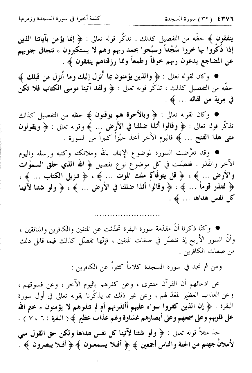 وكان لقوله تعالى: وَبِالْآخِرَةِ هُمْ يُوقِنُونَ حظه من التفصيل كذلك تذكّر قوله تعالى: وَقالُوا أَإِذا ضَلَلْنا فِي الْأَرْضِ ... وقوله تعالى: وَيَقُولُونَ مَتى هذَا الْفَتْحُ ... فاليوم الآخر أخذ حيّزا كبيرا من السورة.