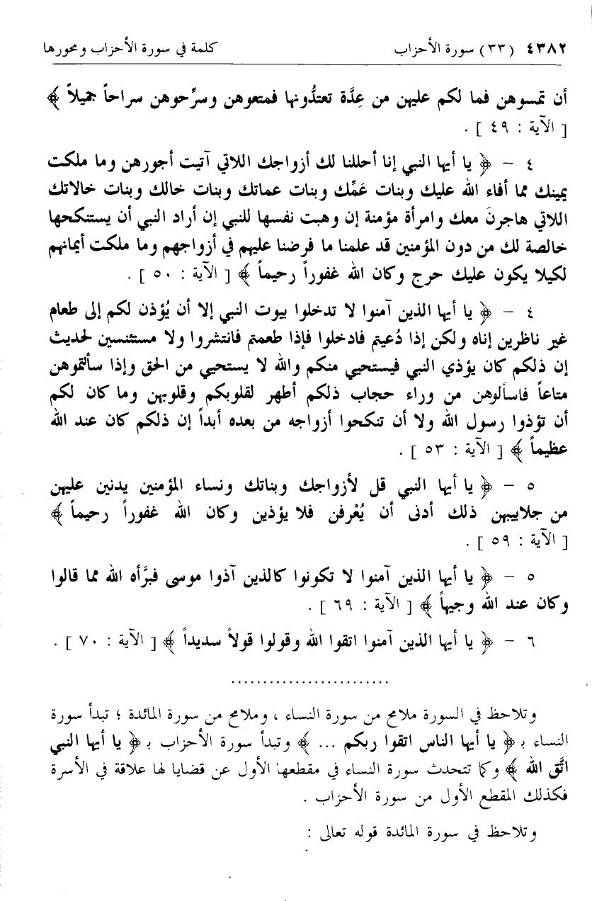 4 - يا أَيُّهَا الَّذِينَ آمَنُوا لا تَدْخُلُوا بُيُوتَ النَّبِيِّ إِلَّا أَنْ يُؤْذَنَ لَكُمْ إِلى طَعامٍ غَيْرَ ناظِرِينَ إِناهُ وَلكِنْ إِذا دُعِيتُمْ فَادْخُلُوا فَإِذا طَعِمْتُمْ فَانْتَشِرُوا وَلا مُسْتَأْنِسِينَ لِحَدِيثٍ إِنَّ ذلِكُمْ كانَ يُؤْذِي النَّبِيَّ فَيَسْتَحْيِي مِنْكُمْ وَاللَّهُ لا يَسْتَحْيِي مِنَ الْحَقِّ وَإِذا سَأَلْتُمُوهُنَّ مَتاعاً فَسْئَلُوهُنَّ مِنْ وَراءِ حِجابٍ ذلِكُمْ أَطْهَرُ لِقُلُوبِكُمْ وَقُلُوبِهِنَّ وَما كانَ لَكُمْ أَنْ تُؤْذُوا رَسُولَ اللَّهِ وَلا أَنْ تَنْكِحُوا أَزْواجَهُ مِنْ بَعْدِهِ أَبَداً إِنَّ ذلِكُمْ كانَ عِنْدَ اللَّهِ عَظِيماً [الآية: 53].