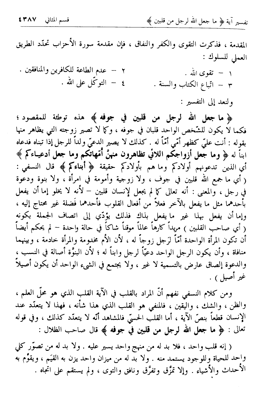(أي ما جمع الله قلبين في جوف، ولا زوجية وأمومة في امرأة، ولا بنوة ودعوة في رجل، والمعنى: أنه تعالى كما لم يجعل لإنسان قلبين- لأنه لا يخلو إما أن يفعل بأحدهما مثل ما يفعل بالآخر فعلا من أفعال القلوب فأحدهما فضلة غير محتاج إليه، وإما أن يفعل بهذا غير ما يفعل بذاك فذلك يؤدّي إلى اتصاف الجملة بكونه (أي صاحب القلبين) مريدا كارها عالما موقنا شاكا في حالة واحدة- لم يحكم أيضا أن تكون المرأة الواحدة أمّا لرجل زوجا له، لأن الأم مخدومة والمرأة خادمة، وبينهما منافاة، وأن يكون الرجل الواحد دعيّا لرجل وابنا له؛ لأن البنوّة أصالة في النسب، والدعوة إلصاق عارض بالتسمية لا غير، ولا يجتمع في الشئ الواحد أن يكون أصيلا غير أصيل).