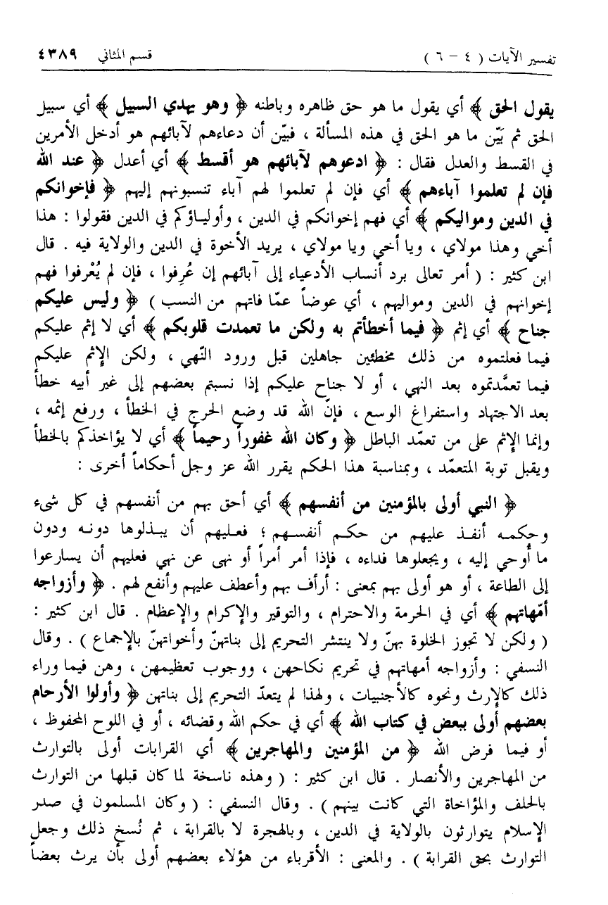 ثم بيّن ما هو الحق في هذه المسألة، فبيّن أن دعاءهم لآبائهم هو أدخل الأمرين في القسط والعدل فقال: ادْعُوهُمْ لِآبائِهِمْ هُوَ أَقْسَطُ أي أعدل عِنْدَ اللَّهِ فَإِنْ لَمْ تَعْلَمُوا آباءَهُمْ أي فإن لم تعلموا لهم آباء تنسبونهم إليهم فَإِخْوانُكُمْ فِي الدِّينِ وَمَوالِيكُمْ أي فهم إخوانكم في الدين، وأولياؤكم في الدين فقولوا: هذا أخي وهذا مولاي، ويا أخي ويا مولاي، يريد الأخوة في الدين والولاية فيه. قال ابن كثير: (أمر تعالى برد أنساب الأدعياء إلى آبائهم إن عرفوا، فإن لم يعرفوا فهم إخوانهم في الدين ومواليهم، أي عوضا عمّا فاتهم من النسب) وَلَيْسَ عَلَيْكُمْ جُناحٌ أي إثم فِيما أَخْطَأْتُمْ بِهِ وَلكِنْ ما تَعَمَّدَتْ قُلُوبُكُمْ أي لا إثم عليكم فيما فعلتموه من ذلك مخطئين جاهلين قبل ورود النّهي، ولكن