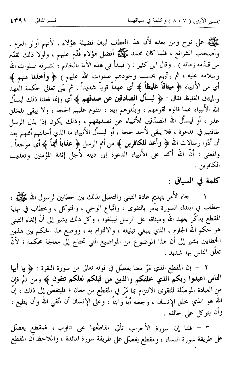 ثم بيّن تعالى حكمة العهد والميثاق الغليظ فقال: لِيَسْئَلَ الصَّادِقِينَ عَنْ صِدْقِهِمْ أي وإنما فعلنا ذلك ليسأل الله الأنبياء عما قالوه لقومهم، وبلّغوهم إياه، لتقوم عليهم الحجة، ولا يبقى للخلق عذر، أو ليسأل الله المصدّقين للأنبياء عن تصديقهم، وذلك يكون إذا بذل الرسل طاقتهم في الدعوة، فلا يبقى لأحد حجة، أو ليسأل الأنبياء ما الذي أجابتهم أممهم بعد أن أدّوا رسالات الله وَأَعَدَّ لِلْكافِرِينَ من أمم الرسل عَذاباً أَلِيماً أي موجعا.