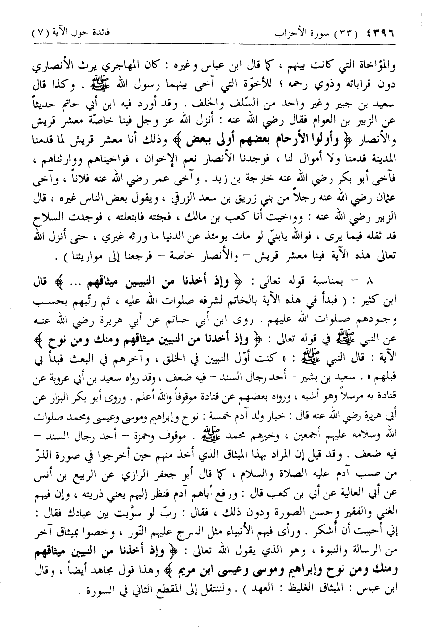 والمؤاخاة التي كانت بينهم، كما قال ابن عباس وغيره: كان المهاجري يرث الأنصاري دون قراباته وذوي رحمه؛ للأخوّة التي آخى بينهما رسول الله صلّى الله عليه وسلم. وكذا قال سعيد بن جبير وغير واحد من السّلف والخلف. وقد أورد فيه ابن أبي حاتم حديثا عن الزبير بن العوام فقال رضي الله عنه: أنزل الله عزّ وجل فينا خاصّة