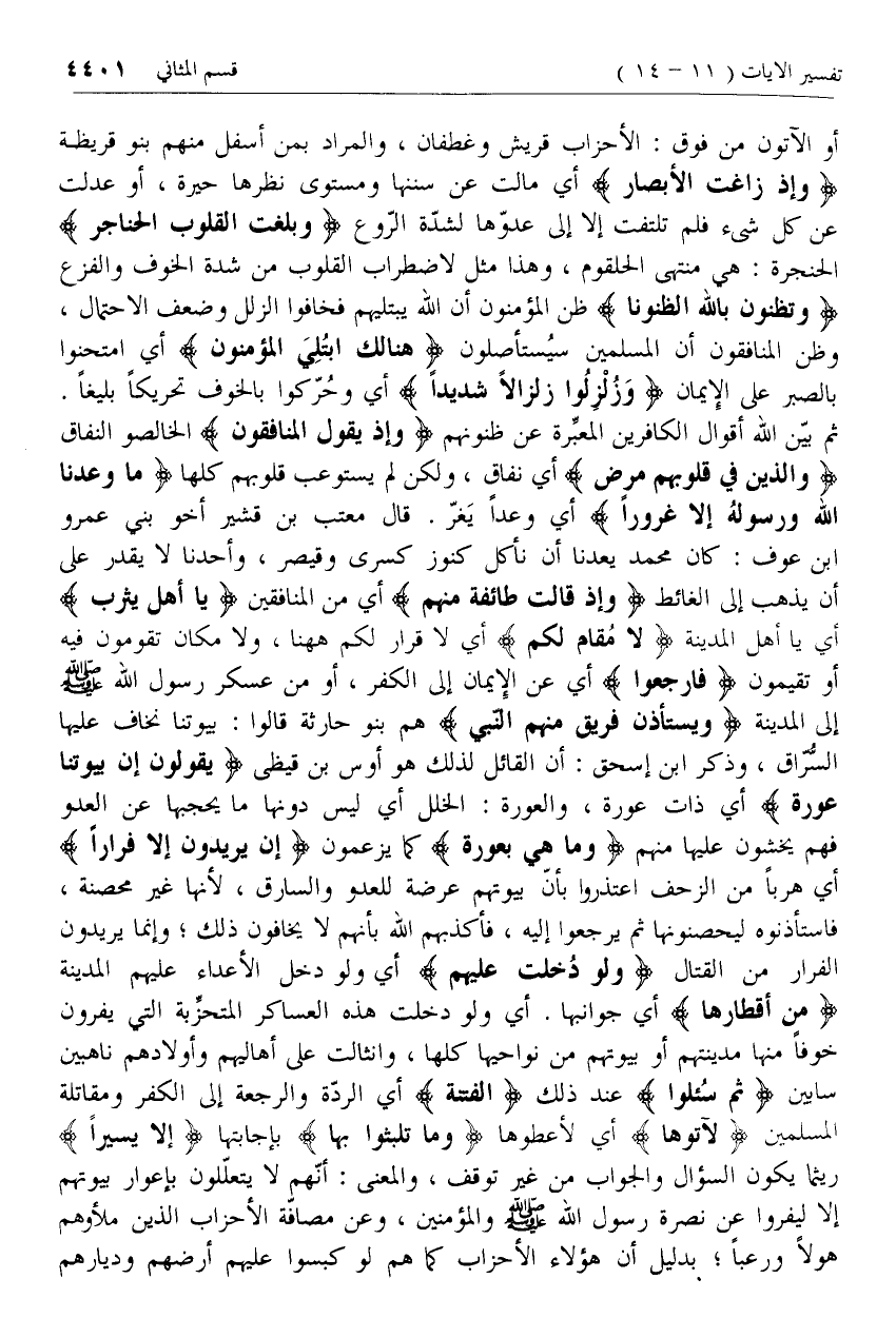 أو الآتون من فوق: الأحزاب قريش وغطفان، والمراد بمن أسفل منهم بنو قريظة وَإِذْ زاغَتِ الْأَبْصارُ أي مالت عن سننها ومستوى نظرها حيرة، أو عدلت عن كل شئ فلم تلتفت إلا إلى عدوّها لشدّة الرّوع وَبَلَغَتِ الْقُلُوبُ الْحَناجِرَ الحنجرة: هي منتهى الحلقوم، وهذا مثل لاضطراب القلوب من شدة الخوف والفزع وَتَظُنُّونَ بِاللَّهِ الظُّنُونَا ظن المؤمنون أن الله يبتليهم فخافوا الزلل وضعف الاحتمال، وظن المنافقون أن المسلمين سيستأصلون