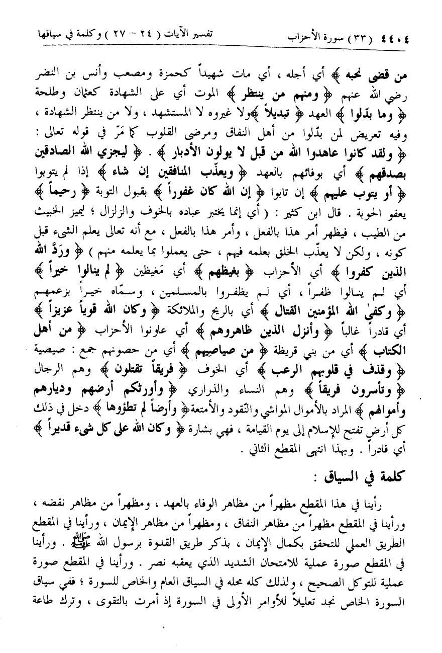 رأينا في هذا المقطع مظهرا من مظاهر الوفاء بالعهد، ومظهرا من مظاهر نقضه، ورأينا في المقطع مظهرا من مظاهر النفاق، ومظهرا من مظاهر الإيمان، ورأينا في المقطع الطريق العملي للتحقق بكمال الإيمان، بذكر طريق القدوة برسول الله صلّى الله عليه وسلم. ورأينا في المقطع صورة عملية للامتحان الشديد الذي يعقبه نصر. ورأينا في المقطع صورة عملية للتوكل الصحيح، ولذلك كله محله في السياق العام والخاص للسورة؛ ففي سياق السورة الخاص نجد تعليلا للأوامر الأولى في السورة إذ أمرت بالتقوى، وترك طاعة