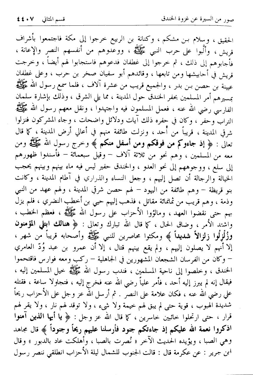 الحقيق، وسلام بن مشكم، وكنانة بن الربيع خرجوا إلى مكة فاجتمعوا بأشراف قريش، وألّبوا على حرب النبي صلّى الله عليه وسلم، ووعدوهم من أنفسهم النصر والإعانة، فأجابوهم إلى ذلك، ثم خرجوا إلى غطفان فدعوهم فاستجابوا لهم أيضا، وخرجت قريش في أحابيشها ومن تابعها، وقائدهم أبو سفيان صخر بن حرب، وعلى غطفان عيينة بن حصن بن بدر، والجميع قريب من عشرة آلاف، فلما سمع رسول الله صلّى الله عليه وسلم بمسيرهم أمر المسلمين بحفر الخندق حول المدينة، مما يلي الشرق، وذلك بإشارة سلمان الفارسي رضي الله عنه، فعمل المسلمون فيه واجتهدوا، ونقل معهم رسول الله صلّى الله عليه وسلم التراب وحفر، وكان في حفره ذلك آيات ودلائل واضحات، وجاء المشركون فنزلوا شرقي المدينة، قريبا من أحد، ونزلت طائفة منهم في أعالي أرض المدينة، كما قال تعالى: إِذْ جاؤُكُمْ مِنْ فَوْقِكُمْ وَمِنْ أَسْفَلَ مِنْكُمْ وخرج رسول الله صلّى الله عليه وسلم ومن معه من المسلمين، وهم نحو من ثلاثة آلاف- وقيل سبعمائة- فأسندوا ظهورهم إلى سلع، ووجوههم إلى نحو العدو، والخندق حفير ليس فيه ماء بينهم وبينهم يحجب الخيالة والرجالة أن تصل إليهم، وجعل النساء والذراري في آطام المدينة، وكانت بنو قريظة- وهم طائفة من اليهود- لهم حصن شرقي المدينة، ولهم عهد من النبي وذمة، وهم قريب من ثمانمائة مقاتل، فذهب إليهم حيي بن أخطب النضري، فلم يزل بهم حتى نقضوا العهد، ومالئوا الأحزاب على رسول الله صلّى الله عليه وسلم، فعظم الخطب، واشتد الأمر، وضاق الحال، كما قال الله تبارك وتعالى: هُنالِكَ ابْتُلِيَ الْمُؤْمِنُونَ وَزُلْزِلُوا زِلْزالًا شَدِيداً ومكثوا محاصرين للنبي صلّى الله عليه وسلم وأصحابه قريبا من شهر، إلا أنهم لا يصلون إليهم، ولم يقع بينهم قتال، إلا أن عمرو بن عبد ودّ العامري- وكان من الفرسان الشجعان المشهورين في الجاهلية- ركب ومعه فوارس فاقتحموا الخندق، وخلصوا إلى ناحية المسلمين، فندب رسول الله صلّى الله عليه وسلم خيل المسلمين إليه، فيقال إنه لم يبرز إليه أحد، فأمر عليا رضي الله عنه فخرج إليه، فتجاولا ساعة، فقتله علي رضي الله عنه، فكان علامة على النصر. ثم أرسل الله عزّ وجل على الأحزاب ريحا شديدة الهبوب، قوية حتى لم يبق لهم خيمة ولا شئ، ولا توقد لهم نار، ولا يقر لهم قرار، حتى ارتحلوا خائبين خاسرين، كما قال الله عزّ وجل: يا أَيُّهَا الَّذِينَ آمَنُوا اذْكُرُوا نِعْمَةَ اللَّهِ عَلَيْكُمْ إِذْ جاءَتْكُمْ جُنُودٌ فَأَرْسَلْنا عَلَيْهِمْ رِيحاً وَجُنُوداً قال مجاهد وهي الصبا، ويؤيده الحديث الآخر «نصرت بالصبا، وأهلكت عاد بالدبور» وقال ابن جرير: عن عكرمة قال: قالت الجنوب للشمال ليلة الأحزاب انطلقي ننصر رسول