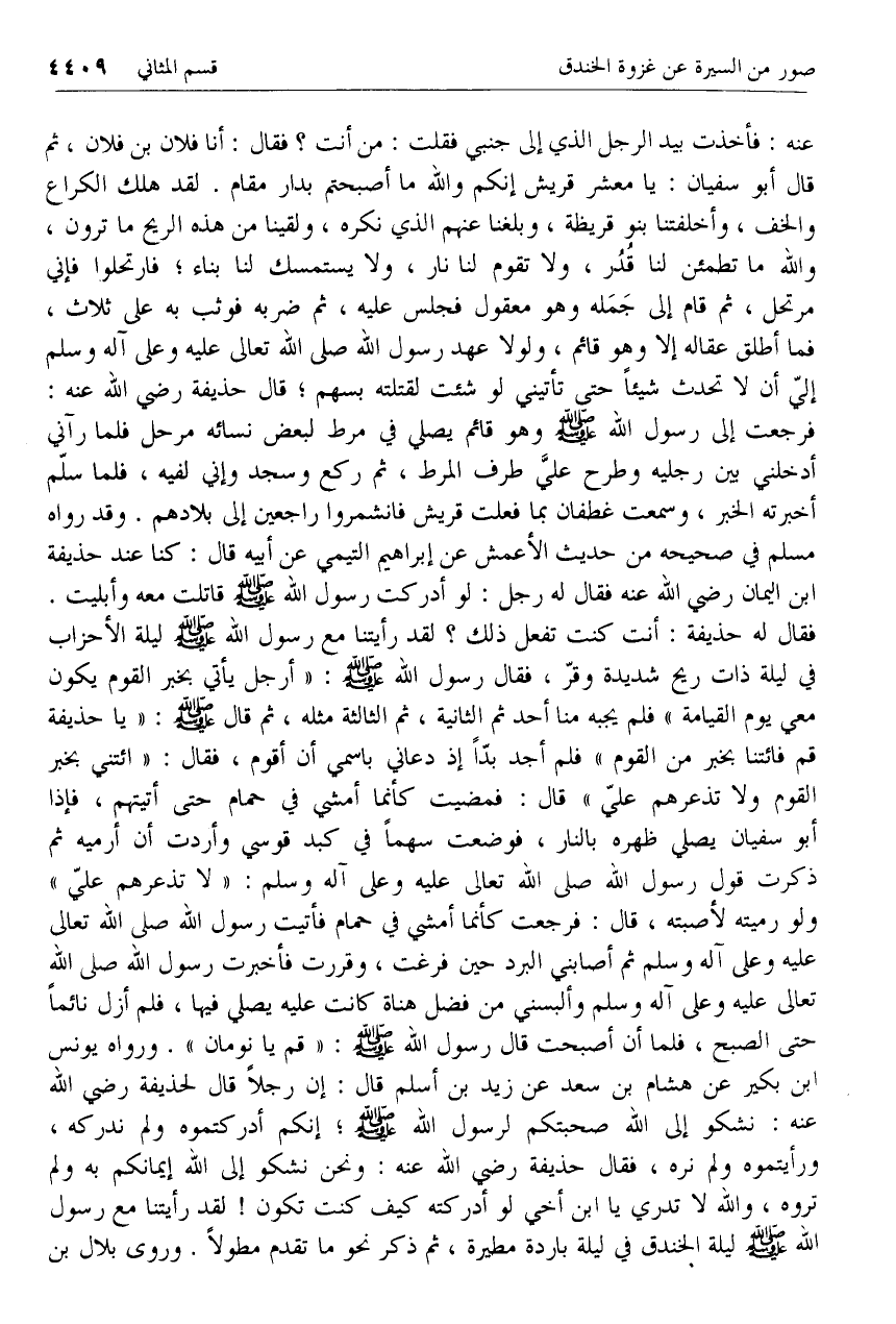 فقال له حذيفة: أنت كنت تفعل ذلك؟ لقد رأيتنا مع رسول الله صلّى الله عليه وسلم ليلة الأحزاب في ليلة ذات ريح شديدة وقرّ، فقال رسول الله صلّى الله عليه وسلم: «أرجل يأتي بخبر القوم يكون معي يوم القيامة» فلم يجبه منا أحد ثم الثانية، ثم الثالثة مثله، ثم قال صلّى الله عليه وسلم: «يا حذيفة قم فائتنا بخبر من القوم» فلم أجد بدّا إذ دعاني باسمي أن أقوم، فقال: «ائتني بخبر القوم ولا تذعرهم عليّ» قال: فمضيت كأنما أمشي في حمام حتى أتيتهم، فإذا أبو سفيان يصلي ظهره بالنار، فوضعت سهما في كبد قوسي وأردت أن أرميه ثم ذكرت قول رسول الله صلّى الله تعالى عليه وعلى آله وسلم: «لا تذعرهم عليّ» ولو رميته لأصبته، قال: فرجعت كأنما أمشي في حمام فأتيت رسول الله صلّى الله تعالى عليه وعلى آله وسلم ثم أصابني البرد حين فرغت، وقررت فأخبرت رسول الله صلّى الله تعالى عليه وعلى آله وسلم وألبسني من فضل هناة كانت عليه يصلي فيها، فلم أزل نائما حتى الصبح، فلما أن أصبحت قال رسول الله صلّى الله عليه وسلم: «قم يا نومان». ورواه يونس ابن بكير عن هشام بن سعد عن زيد بن أسلم قال: إن رجلا قال لحذيفة رضي الله عنه: نشكو إلى الله صحبتكم لرسول الله صلّى الله عليه وسلم؛ إنكم أدركتموه ولم ندركه، ورأيتموه ولم نره، فقال حذيفة رضي الله عنه: ونحن نشكو إلى الله إيمانكم به ولم تروه، والله لا تدري يا ابن أخي لو أدركته كيف كنت تكون! لقد رأيتنا مع رسول الله صلّى الله عليه وسلم ليلة الخندق في ليلة باردة مطيرة، ثم ذكر نحو ما تقدم مطولا. وروى بلال بن