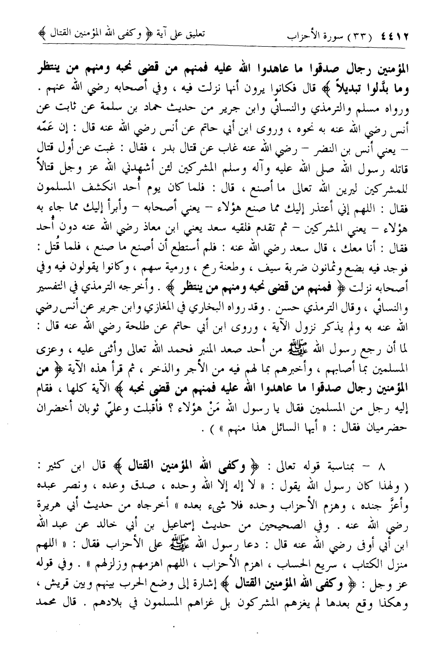 8 - [كلام ابن كثير بمناسبة آية وَكَفَى اللَّهُ الْمُؤْمِنِينَ الْقِتالَ]