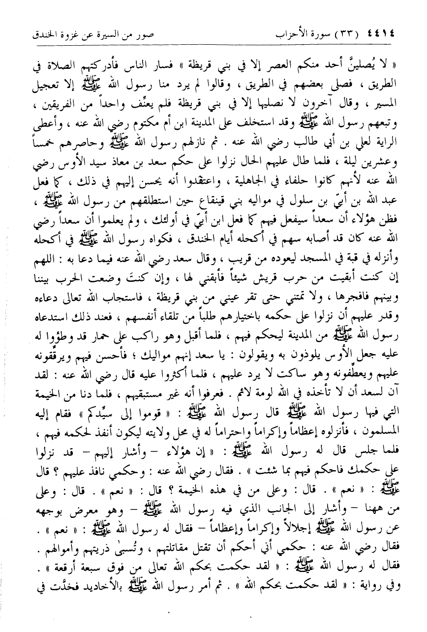 «لا يصلينّ أحد منكم العصر إلا في بني قريظة» فسار الناس فأدركتهم الصلاة في الطريق، فصلى بعضهم في الطريق، وقالوا لم يرد منا رسول الله صلّى الله عليه وسلم إلا تعجيل المسير، وقال آخرون لا نصليها إلا في بني قريظة فلم يعنّف واحدا من الفريقين، وتبعهم رسول الله صلّى الله عليه وسلم وقد استخلف على المدينة ابن أم مكتوم رضي الله عنه، وأعطى الراية لعلي بن أبي طالب رضي الله عنه. ثم نازلهم رسول الله صلّى الله عليه وسلم وحاصرهم خمسا وعشرين ليلة، فلما طال عليهم الحال نزلوا على حكم سعد بن معاذ سيد الأوس رضي الله عنه لأنهم كانوا حلفاء في الجاهلية، واعتقدوا أنه يحسن إليهم في ذلك، كما فعل عبد الله بن أبيّ بن سلول في مواليه بني قينقاع حين استطلقهم من رسول الله صلّى الله عليه وسلم، فظن هؤلاء أن سعدا سيفعل فيهم كما فعل ابن أبيّ في أولئك، ولم يعلموا أن سعدا رضي الله عنه كان قد أصابه سهم في أكحله أيام الخندق، فكواه رسول الله صلّى الله عليه وسلم في أكحله وأنزله في قبة في المسجد ليعوده من قريب، وقال سعد رضي الله عنه فيما دعا به: اللهم إن كنت أبقيت من حرب قريش شيئا فأبقني لها، وإن كنت وضعت الحرب بيننا وبينهم فافجرها، ولا تمتني حتى تقر عيني من بني قريظة، فاستجاب الله تعالى دعاءه وقدر عليهم أن نزلوا على حكمه باختيارهم طلبا من تلقاء أنفسهم، فعند ذلك استدعاه رسول الله صلّى الله عليه وسلم من المدينة ليحكم فيهم، فلما أقبل وهو راكب على حمار قد وطئوا له عليه جعل الأوس يلوذون به ويقولون: يا سعد إنهم مواليك؛ فأحسن فيهم ويرقّقونه عليهم ويعطّفونه وهو ساكت لا يرد عليهم، فلما أكثروا عليه قال رضي الله عنه: لقد آن لسعد أن لا تأخذه في الله لومة لائم. فعرفوا أنه غير مستبقيهم، فلما دنا من الخيمة التي فيها رسول الله صلّى الله عليه وسلم قال رسول الله صلّى الله عليه وسلم: «قوموا إلى سيّدكم» فقام إليه المسلمون، فأنزلوه إعظاما وإكراما واحتراما له في محل ولايته ليكون أنفذ لحكمه فيهم، فلما جلس قال له رسول الله صلّى الله عليه وسلم: «إن هؤلاء- وأشار إليهم- قد نزلوا على حكمك فاحكم فيهم بما شئت». فقال رضي الله عنه: وحكمي نافذ عليهم؟ قال صلّى الله عليه وسلم: «نعم». قال: وعلى من في هذه الخيمة؟ قال: «نعم». قال: وعلى من هاهنا- وأشار إلى الجانب الذي فيه رسول الله صلّى الله عليه وسلم- وهو معرض بوجهه عن رسول الله صلّى الله عليه وسلم إجلالا وإكراما وإعظاما- فقال له رسول الله صلّى الله عليه وسلم: «نعم».