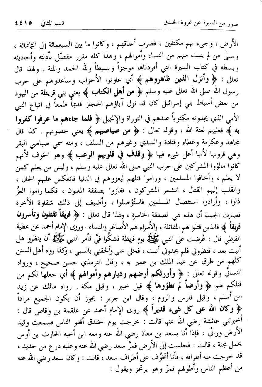 الأرض، وجيء بهم مكتفين، فضرب أعناقهم، وكانوا ما بين السبعمائة إلى الثمانمائة، وسبى من لم ينبت منهم من النساء وأموالهم، وهذا كله مقرر مفصّل بأدلته وأحاديثه وبسطه في كتاب السيرة التي أفردناها موجزا وبسيطا ولله الحمد والمنة. ولهذا قال تعالى: وَأَنْزَلَ الَّذِينَ ظاهَرُوهُمْ أي عاونوا الأحزاب وساعدوهم على حرب رسول الله صلّى الله تعالى عليه وسلم مِنْ أَهْلِ الْكِتابِ يعني بني قريظة من اليهود من بعض أسباط بني إسرائيل كان قد نزل آباؤهم الحجاز قديما طمعا في اتباع النبي الأمي الذي يجدونه مكتوبا عندهم في التوراة والإنجيل فَلَمَّا جاءَهُمْ ما عَرَفُوا كَفَرُوا بِهِ فعليهم لعنة الله، وقوله تعالى: مِنْ صَياصِيهِمْ يعني حصونهم. كذا قال مجاهد وعكرمة وعطاء وقتادة والسدي وغيرهم من السلف، ومنه سمي صياصي البقر وهي قرونها لأنها أعلى شئ فيها وَقَذَفَ فِي قُلُوبِهِمُ الرُّعْبَ وهو الخوف لأنهم كانوا مالئوا المشركين على حرب النبي صلّى الله تعالى عليه وسلم، وليس من يعلم كمن لا يعلم، وأخافوا المسلمين، وراموا قتلهم ليعزوهم في الدنيا فانعكس عليهم الحال، وانقلب إليهم القتال، انشمر المشركون، ففازوا بصفقة المغبون، فكما راموا العزّ ذلوا، وأرادوا استئصال المسلمين فاستؤصلوا، وأضيف إلى ذلك شقاوة الآخرة فصارت الجملة أن هذه هي الصفقة الخاسرة، ولهذا قال تعالى: فَرِيقاً تَقْتُلُونَ وَتَأْسِرُونَ فَرِيقاً فالذين قتلوا هم المقاتلة، والأسراء هم الأصاغر والنساء. وروى الإمام أحمد عن عطية القرظي قال: عرضت على النبي صلّى الله عليه وسلم يوم قريظة فشكّوا فيّ فأمر النبي صلّى الله عليه وسلم أن ينظروا هل أنبت بعد، فنظروني فلم يجدوني أنبت، فخلى عني وألحقني بالسبي، وكذا رواه أهل السنن كلهم من طرق عن عبد الملك بن عمير به، وقال الترمذي حسن صحيح، ورواه النسائي وقوله تعالى: وَأَوْرَثَكُمْ أَرْضَهُمْ وَدِيارَهُمْ وَأَمْوالَهُمْ أي جعلها لكم من قتلكم لهم وَأَرْضاً لَمْ تَطَؤُها قيل خيبر، وقيل مكة. رواه مالك عن زيد ابن أسلم، وقيل فارس والروم، وقال ابن جرير: يجوز أن يكون الجميع مرادا وَكانَ اللَّهُ عَلى كُلِّ شَيْءٍ قَدِيراً روى الإمام أحمد عن علقمة بن وقاص قال: