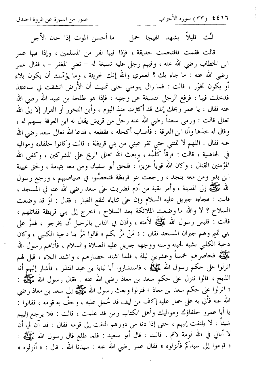 قالت فقمت فاقتحمت حديقة، فإذا فيها نفر من المسلمين، وإذا فيها عمر ابن الخطاب رضي الله عنه، وفيهم رجل عليه تسبغة له- تعني المغفر-، فقال عمر رضي الله عنه: ما جاء بك؟ لعمري والله إنك لجريئة، وما يؤمّنك أن يكون بلاء أو يكون تخوّر، قالت: فما زال يلومني حتى تمنيت أن الأرض انشقت بي ساعتئذ فدخلت فيها، فرفع الرجل التسبغة عن وجهه، فإذا هو طلحة بن عبيد الله رضي الله عنه فقال: يا عمر ويحك إنك قد أكثرت منذ اليوم، وأين التحوز أو الفرار إلا إلى الله تعالى قالت: ورمى سعدا رضي الله عنه رجل من قريش يقال له ابن العرقة بسهم له، وقال له خذها وأنا ابن العرقة، فأصاب أكحله، فقطعه، فدعا الله تعالى سعد رضي الله عنه فقال: اللهم لا تمتني حتى تقر عيني من بني قريظة، قالت وكانوا حلفاءه ومواليه في الجاهلية، قالت: فرقأ كلمه، وبعث الله تعالى الريح على المشركين، وكفى الله المؤمنين القتال، وكان الله قويا عزيزا، فلحق أبو سفيان ومن معه بتهامة، ولحق عيينة ابن بدر ومن معه بنجد، ورجعت بنو قريظة فتحصّنوا في صياصيهم، ورجع رسول الله صلّى الله عليه وسلم إلى المدينة، وأمر بقبة من أدم فضربت على سعد رضي الله عنه في المسجد، قالت: فجاءه جبريل عليه السلام وإن على ثناياه لنقع الغبار، فقال: أو قد وضعت السلاح؟ لا والله ما وضعت الملائكة بعد السلاح، اخرج إلى بني قريظة فقاتلهم، قالت: فلبس رسول الله صلّى الله عليه وسلم لأمته، وأذن في الناس بالرحيل أن يخرجوا، فمرّ على بني تميم وهم جيران المسجد فقال: «من مرّ بكم» قالوا مرّ بنا دحية الكلبي، وكان دحية الكلبي يشبه لحيته وسنه ووجهه جبريل عليه الصلاة والسلام، فأتاهم رسول الله صلّى الله عليه وسلم فحاصرهم خمسا وعشرين ليلة، فلما اشتد حصارهم، واشتد البلاء، قيل لهم انزلوا على حكم رسول الله صلّى الله عليه وسلم، فاستشاروا أبا لبابة بن عبد المنذر، فأشار إليهم أنه الذبح، قالوا ننزل على حكم سعد بن معاذ رضي الله عنه. فقال رسول الله صلّى الله عليه وسلم: