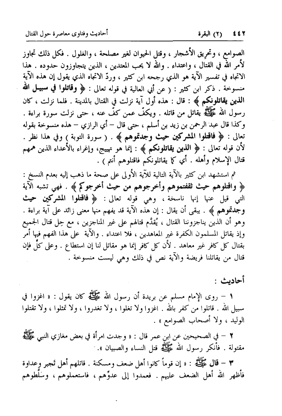 الصوامع، وتحريق الأشجار، وقتل الحيوان لغير مصلحة، والغلول. فكل ذلك تجاوز لأمر الله في القتال، واعتداء. والله لا يحب المعتدين، الذين يتجاوزون حدوده. هذا الاتجاه في تفسير الآية هو الذي رجحه ابن كثير، ورد الاتجاه الذي يقول إن هذه الآية منسوخة. ذكر ابن كثير: (عن أبي العالية في قوله تعالى: وَقاتِلُوا فِي سَبِيلِ اللَّهِ الَّذِينَ يُقاتِلُونَكُمْ: قال: هذه أول آية نزلت في القتال بالمدينة. فلما نزلت، كان رسول الله صلى الله عليه وسلم يقاتل من قاتله. ويكف عمن كف عنه، حتى نزلت سورة براءة.