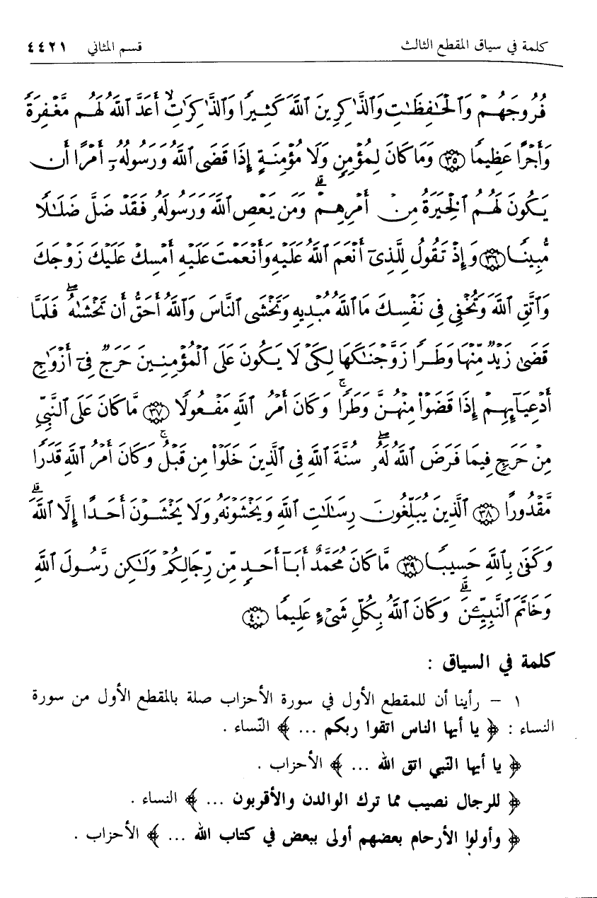 1 - رأينا أن للمقطع الأول في سورة الأحزاب صلة بالمقطع الأول من سورة النساء: يا أَيُّهَا النَّاسُ اتَّقُوا رَبَّكُمُ ... النّساء.
