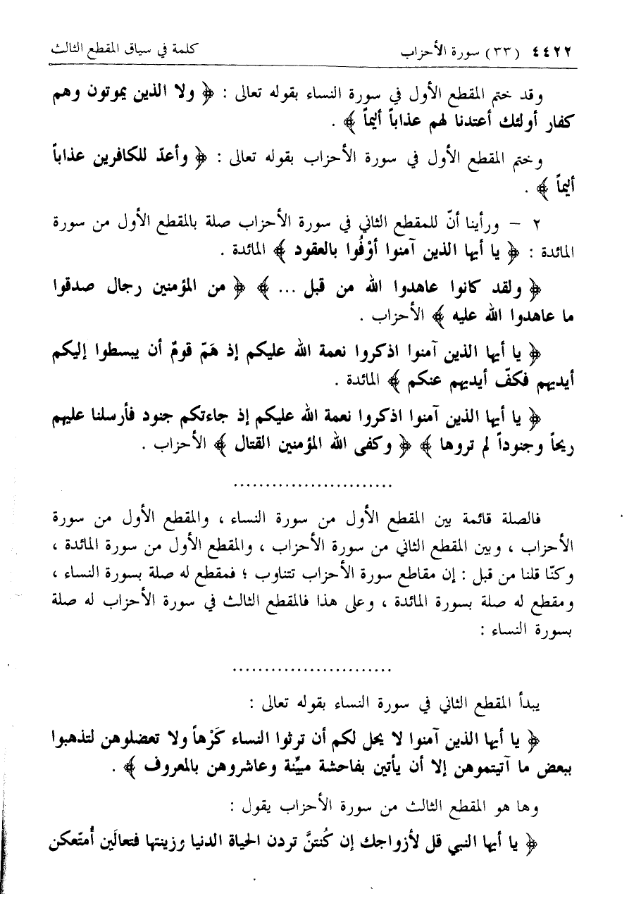 فالصلة قائمة بين المقطع الأول من سورة النساء، والمقطع الأول من سورة الأحزاب، وبين المقطع الثاني من سورة الأحزاب، والمقطع الأول من سورة المائدة، وكنّا قلنا من قبل: إن مقاطع سورة الأحزاب تتناوب؛ فمقطع له صلة بسورة النساء، ومقطع له صلة بسورة المائدة، وعلى هذا فالمقطع الثالث في سورة الأحزاب له صلة