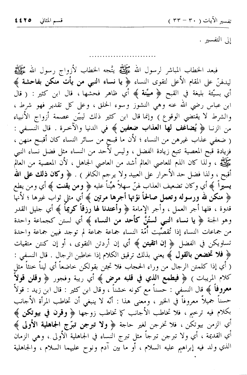 يا نِساءَ النَّبِيِّ لَسْتُنَّ كَأَحَدٍ مِنَ النِّساءِ أي لستن كجماعة واحدة من جماعات النساء إذا تقصّيت أمّة النساء جماعة جماعة لم توجد فيهن جماعة واحدة تساويكن في الفضل إِنِ اتَّقَيْتُنَّ أي إن أردتن التقوى، أو إن كنتن متقيات فَلا تَخْضَعْنَ بِالْقَوْلِ يعني بذلك ترقيق الكلام إذا خاطبن الرجال. قال النسفي: