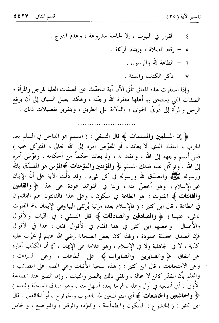 إِنَّ الْمُسْلِمِينَ وَالْمُسْلِماتِ قال النسفي: (المسلم هو الداخل في السلم بعد الحرب، المنقاد الذي لا يعاند، أو المفوّض أمره إلى الله تعالى، المتوكل عليه) فمن أسلم وجهه إلى الله، وانقاد له، ولم يعاند حكما من أحكامه، وفوّض أمره إلى الله، وتوكّل عليه فذلك المسلم وَالْمُؤْمِنِينَ وَالْمُؤْمِناتِ المؤمن هو المصدّق بالله ورسوله صلّى الله عليه وسلم والمصدّق لله ورسوله في كل شئ. وقد دلّت الآية على أنّ الإيمان غير الإسلام، وهو أخصّ منه، ولنا في الفوائد عودة على هذا وَالْقانِتِينَ وَالْقانِتاتِ القنوت: هو الطاعة في سكون، وعلى هذا فالقانتون هم القائمون في الطاعة، قال ابن كثير: (فالإسلام بعده مرتبة يرتقى إليها وهي الإيمان، ثم القنوت ناشئ عنهما) وَالصَّادِقِينَ وَالصَّادِقاتِ قال النسفي: في النّيات والأقوال والأعمال. وخصها ابن كثير في هذا المقام في الأقوال فقال: هذا في الأقوال فإن الصدق خصلة محمودة، ولهذا كان بعض الصحابة رضي الله عنهم لم تجرّب عليه كذبة، لا في الجاهلية ولا في الإسلام، وهو علامة على الإيمان، كما أن الكذب أمارة على النفاق وَالصَّابِرِينَ وَالصَّابِراتِ على الطاعات، وعن السيئات، وعلى الامتحانات، قال ابن كثير: (هذه سجية الأثبات وهي الصبر على المصائب، والعلم بأنّ المقدّر كائن لا محالة، وتلقي ذلك بالصبر والثبات، وإنما الصبر عند الصدمة الأولى: أي أصعبه في أول وهلة، ثم ما بعده أسهل منه، وهو صدق السجيّة وثباتها) وَالْخاشِعِينَ وَالْخاشِعاتِ أي المتواضعين لله بالقلوب والجوارح، أو الخائفين. قال ابن كثير: (الخشوع: السكون والطمأنينة، والتؤدة والوقار، والتواضع، والحامل