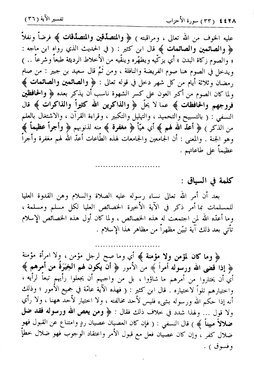 وَما كانَ لِمُؤْمِنٍ وَلا مُؤْمِنَةٍ أي وما صح لرجل مؤمن، ولا امرأة مؤمنة إِذا قَضَى اللَّهُ وَرَسُولُهُ أَمْراً من الأمور أَنْ يَكُونَ لَهُمُ الْخِيَرَةُ مِنْ أَمْرِهِمْ أي أن يختاروا من أمرهم ما شاءوا، بل من واجبهم أن يجعلوا رأيهم تبعا لرأيه، واختيارهم تلوا لاختياره. قال ابن كثير: (فهذه الآية عامّة في جميع الأمور؛ وذلك أنه إذا حكم الله ورسوله بشيء فليس لأحد مخالفته، ولا اختيار لأحد هاهنا، ولا رأي ولا قول ... ولهذا شدد في خلاف ذلك فقال: وَمَنْ يَعْصِ اللَّهَ وَرَسُولَهُ فَقَدْ ضَلَّ ضَلالًا مُبِيناً) قال النسفي: (فإن كان العصيان عصيان رد وامتناع عن القبول فهو ضلال كفر، وإن كان عصيان فعل مع قبول الأمر واعتقاد الوجوب فهو ضلال خطأ وفسوق).