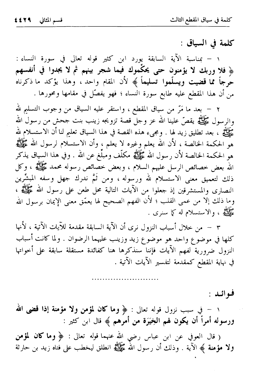 3 - من خلال أسباب النزول نرى أن الآية السابقة مقدمة للآيات الآتية، لأنها كلها في موضوع واحد هو موضوع زيد وزينب عليهما الرضوان. ولما كانت أسباب النزول ضرورية لفهم الآيات فإننا سنذكرها هنا كفائدة مستقلة سابقة على أخواتها في نهاية المقطع كمقدمة لتفسير الآيات الآتية.