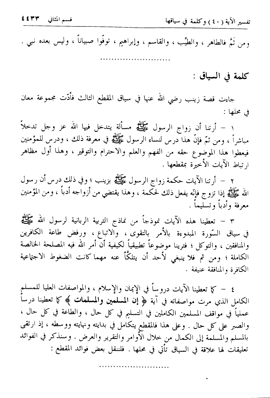4 - كما تعطينا الآيات دروسا في الإيمان والإسلام، والمواصفات العليا للمسلم الكامل الذي مرت مواصفاته في آية إِنَّ الْمُسْلِمِينَ وَالْمُسْلِماتِ كما تعطينا درسا عمليا في مواقف المسلمين الكاملين في التسليم في كل حال، والطاعة في كل حال، والصبر على كل حال. وعلى هذا فالمقطع يتكامل في بدايته ونهايته ووسطه، إذ ارتقى بالمسلم والمسلمة إلى الكمال من خلال الأوامر والتقرير والعرض. وسنذكر في الفوائد تعليقات لها علاقة في السياق تأتي في محلها. فلننقل بعض فوائد المقطع: