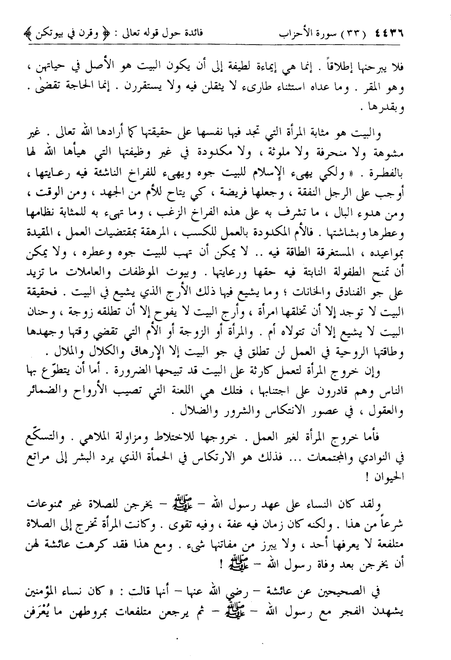 وإن خروج المرأة لتعمل كارثة على البيت قد تبيحها الضرورة. أما أن يتطوّع بها الناس وهم قادرون على اجتنابها، فتلك هي اللعنة التي تصيب الأرواح والضمائر والعقول، في عصور الانتكاس والشرور والضلال.