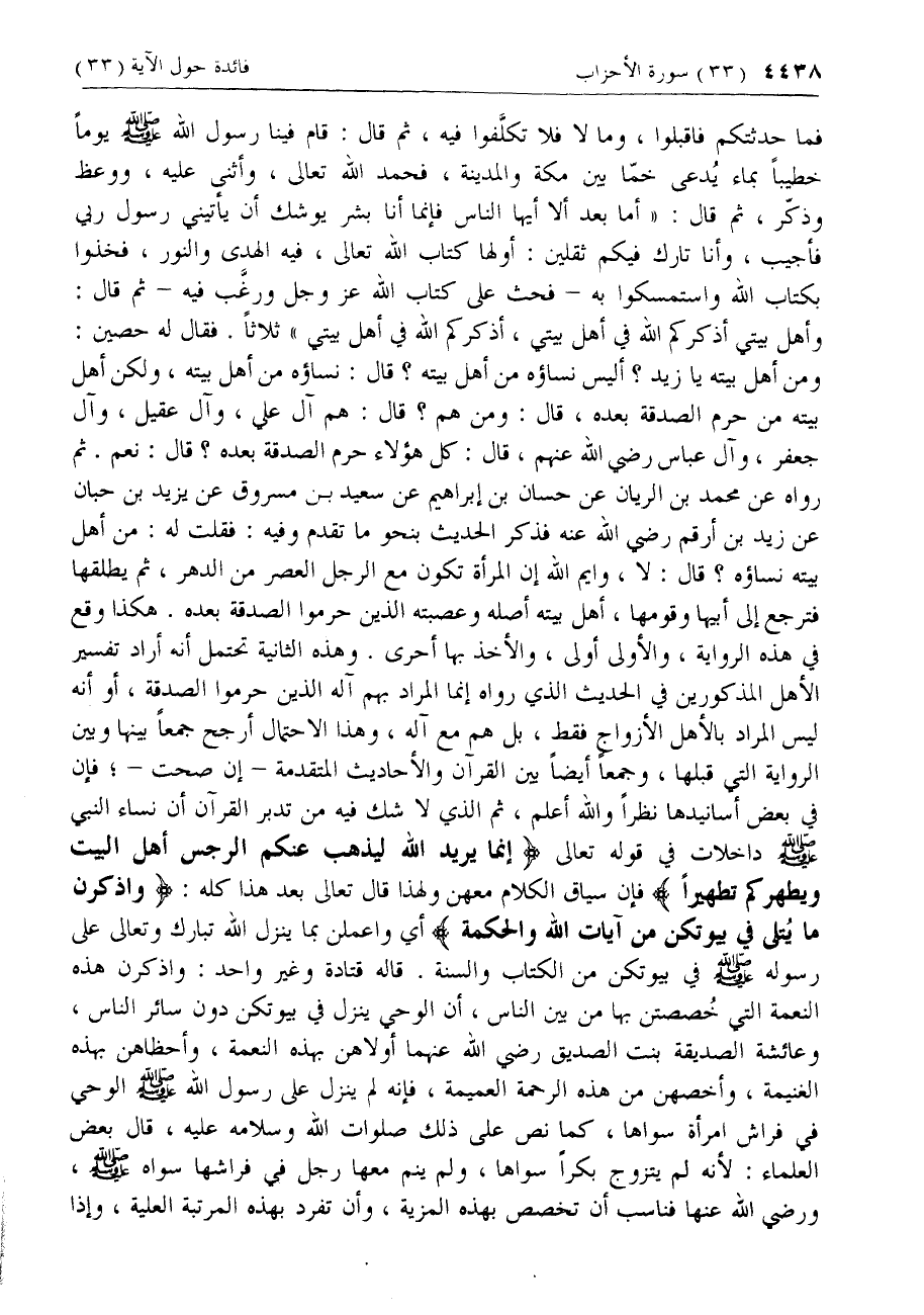ومن أهل بيته يا زيد؟ أليس نساؤه من أهل بيته؟ قال: نساؤه من أهل بيته، ولكن أهل بيته من حرم الصدقة بعده، قال: ومن هم؟ قال: هم آل علي، وآل عقيل، وآل جعفر، وآل عباس رضي الله عنهم، قال: كل هؤلاء حرم الصدقة بعده؟ قال: نعم. ثم رواه عن محمد بن الريان عن حسان بن إبراهيم عن سعيد بن مسروق عن يزيد بن حبان عن زيد بن أرقم رضي الله عنه فذكر الحديث بنحو ما تقدم وفيه: فقلت له: من أهل بيته نساؤه؟ قال: لا، وايم الله إن المرأة تكون مع الرجل العصر من الدهر، ثم يطلقها فترجع إلى أبيها وقومها، أهل بيته أصله وعصبته الذين حرموا الصدقة بعده. هكذا وقع في هذه الرواية، والأولى أولى، والأخذ بها أحرى. وهذه الثانية تحتمل أنه أراد تفسير الأهل المذكورين في الحديث الذي رواه إنما المراد بهم آله الذين حرموا الصدقة، أو أنّه ليس المراد بالأهل الأزواج فقط، بل هم مع آله، وهذا الاحتمال أرجح جمعا بينها وبين الرواية التي قبلها، وجمعا أيضا بين القرآن والأحاديث المتقدمة- إن صحت-؛ فإن في بعض أسانيدها نظرا والله أعلم، ثم الذي لا شك فيه من تدبر القرآن أن نساء النبي صلّى الله عليه وسلم داخلات في قوله تعالى إِنَّما يُرِيدُ اللَّهُ لِيُذْهِبَ عَنْكُمُ الرِّجْسَ أَهْلَ الْبَيْتِ وَيُطَهِّرَكُمْ تَطْهِيراً فإن سياق الكلام معهن ولهذا قال تعالى بعد هذا كله: وَاذْكُرْنَ ما يُتْلى فِي بُيُوتِكُنَّ مِنْ آياتِ اللَّهِ وَالْحِكْمَةِ أي واعملن بما ينزل الله تبارك وتعالى على رسوله صلّى الله عليه وسلم في بيوتكن من الكتاب والسنة. قاله قتادة وغير واحد: واذكرن هذه النعمة التي خصصتن بها من بين الناس، أن الوحي ينزل في بيوتكن دون سائر الناس، وعائشة الصديقة بنت الصديق رضي الله عنهما أولاهن بهذه النعمة، وأحظاهن بهذه الغنيمة، وأخصهن من هذه الرحمة العميمة، فإنه لم ينزل على رسول الله صلّى الله عليه وسلم الوحي في فراش امرأة سواها، كما نص على ذلك صلوات الله وسلامه عليه، قال بعض العلماء: لأنه لم يتزوج بكرا سواها، ولم ينم معها رجل في فراشها سواه صلّى الله عليه وسلم، ورضي الله عنها فناسب أن تخصص بهذه المزية، وأن تفرد بهذه المرتبة العلية، وإذا