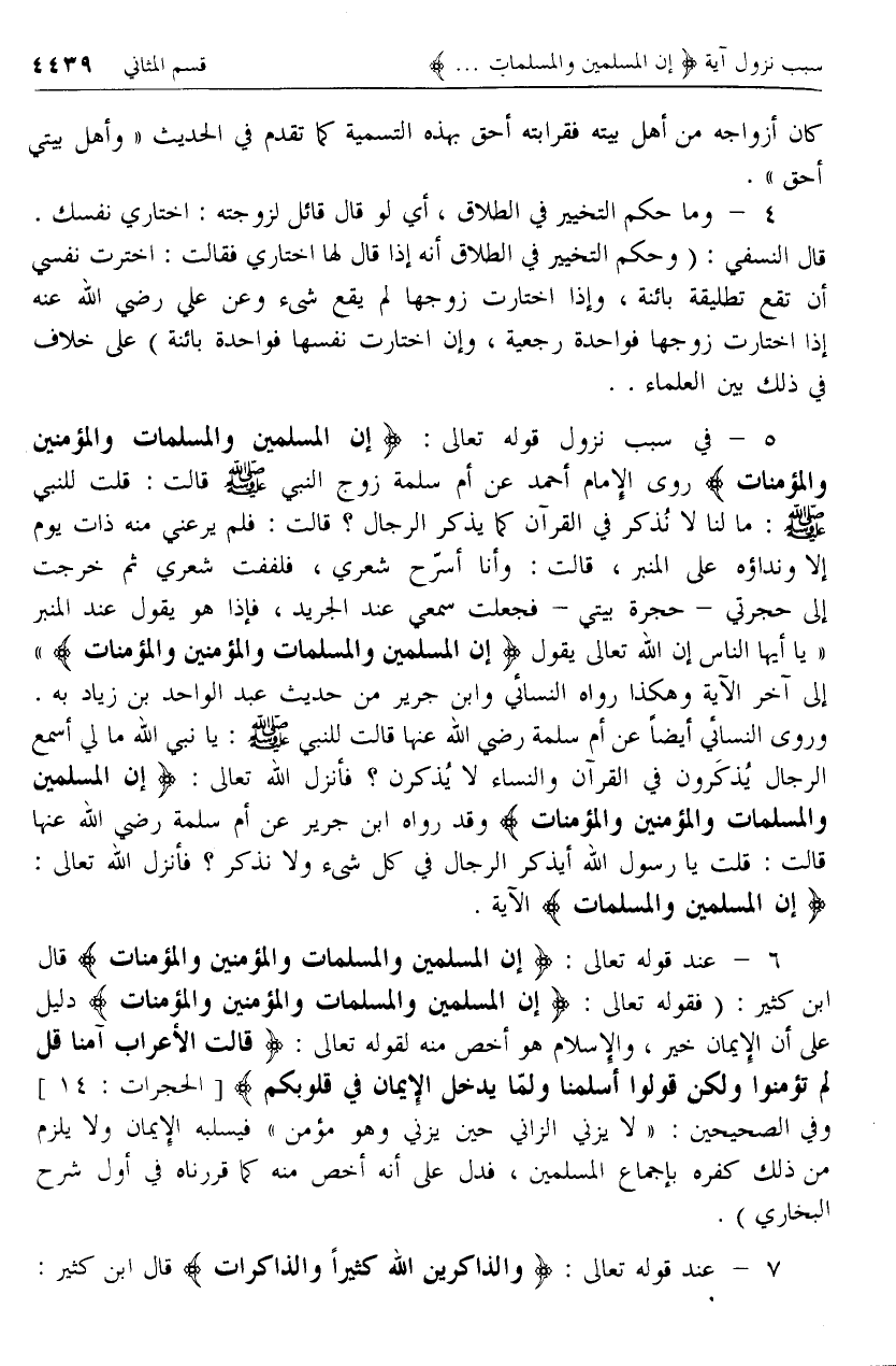 [5، 6 - سبب نزول آية إِنَّ الْمُسْلِمِينَ وَالْمُسْلِماتِ .. وكلام ابن كثير حولها]