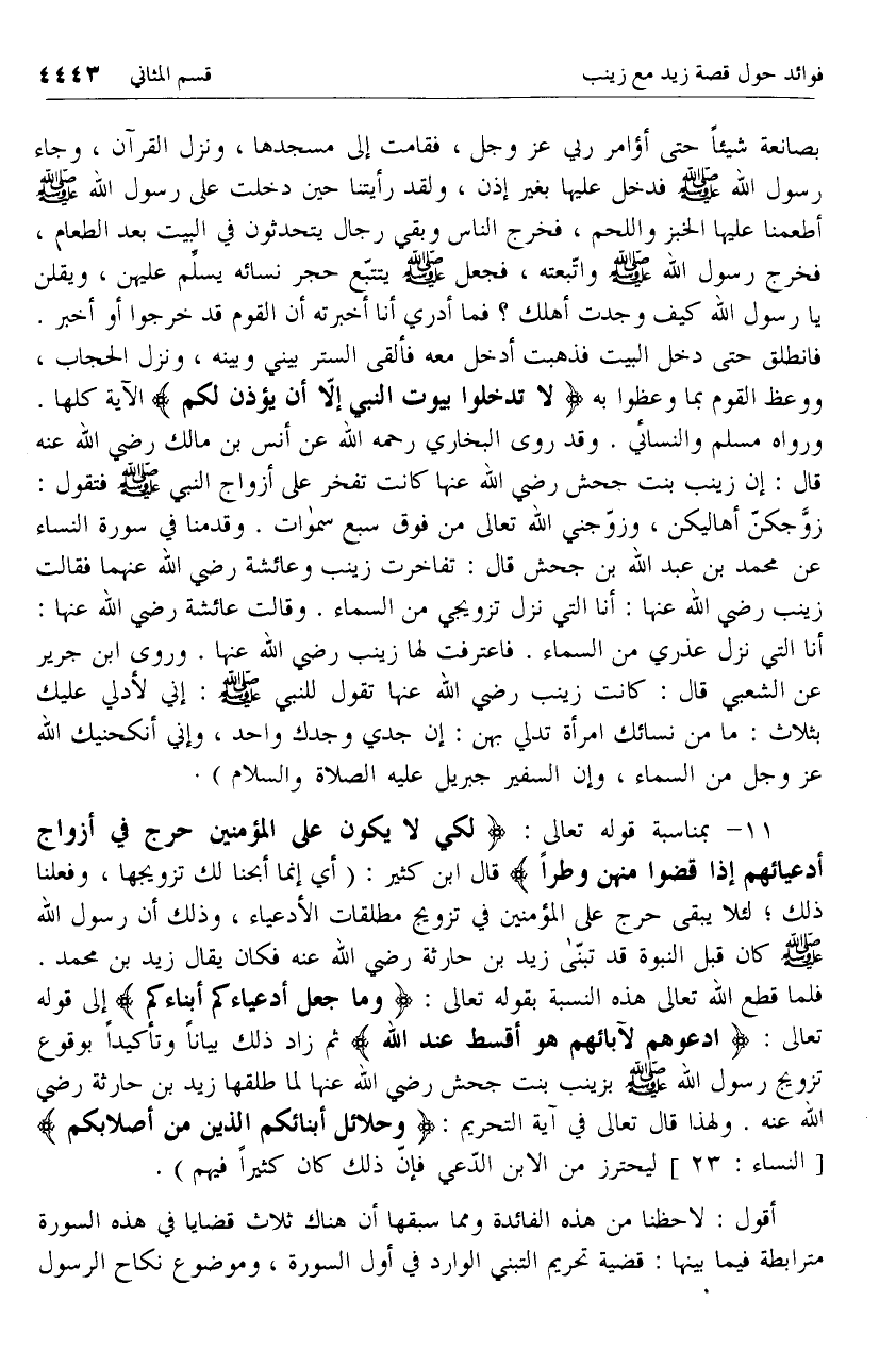 بمناسبة قوله تعالى: لِكَيْ لا يَكُونَ عَلَى الْمُؤْمِنِينَ حَرَجٌ فِي أَزْواجِ أَدْعِيائِهِمْ إِذا قَضَوْا مِنْهُنَّ وَطَراً قال ابن كثير: (أي إنما أبحنا لك تزويجها، وفعلنا ذلك؛ لئلا يبقى حرج على المؤمنين في تزويج مطلقات الأدعياء، وذلك أن رسول الله صلّى الله عليه وسلم كان قبل النبوة قد تبنّى زيد بن حارثة رضي الله عنه فكان يقال زيد بن محمد.