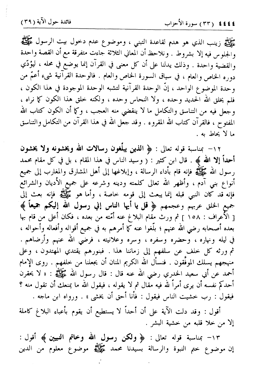 صلّى الله عليه وسلم زينب الذي هو هدم لقاعدة التبني، وموضوع عدم دخول بيت الرسول صلّى الله عليه وسلم والجلوس فيه إلا بشروط. ونلاحظ أن المعاني الثلاثة جاءت متفرقة مع أن القصة واحدة والقضية واحدة. وذلك يدلنا على أن كل معنى في القرآن إنما يوضع في محله، ليؤدّي دوره الخاص والعام، في سياق السورة الخاص والعام. فالوحدة القرآنية شئ أعمّ من وحدة الموضوع الواحد، إنّ الوحدة القرآنية لتشبه الوحدة الموجودة في هذا الكون، فلم يخلق الله الحديد وحده، ولا النحاس وحده، ولكنه خلق هذا الكون كما نراه، وجعل فيه من التناسق والتكامل ما لا ينقضي منه العجب، وكما أن الكون كتاب الله المفتوح، فالقرآن كتاب الله المقروء. وقد جعل الله في هذا القرآن من التكامل والتناسق ما لا يحاط به.