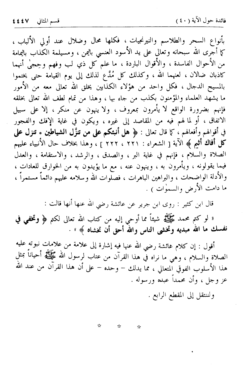 بأنواع السحر والطلاسم والنيرنجيات، فكلها محال وضلال عند أولي الألباب، كما أجرى الله سبحانه وتعالى على يد الأسود العنسي باليمن، ومسيلمة الكذاب باليمامة من الأحوال الفاسدة، والأقوال الباردة، ما علم كل ذي لب وفهم وحجى أنهما كاذبان ضالان، لعنهما الله، وكذلك كل مدّع لذلك إلى يوم القيامة حتى يختموا بالمسيح الدجال، فكل واحد من هؤلاء الكذابين يخلق الله تعالى معه من الأمور ما يشهد العلماء والمؤمنون بكذب من جاء بها، وهذا من تمام لطف الله تعالى بخلقه فإنهم بضرورة الواقع لا يأمرون بمعروف، ولا ينهون عن منكر، إلا على سبيل الاتفاق، أو لما لهم فيه من المقاصد إلى غيره، ويكون في غاية الإفك والفجور في أقوالهم وأفعالهم، كما قال تعالى: هَلْ أُنَبِّئُكُمْ عَلى مَنْ تَنَزَّلُ الشَّياطِينُ* تَنَزَّلُ عَلى كُلِّ أَفَّاكٍ أَثِيمٍ الآية [الشعراء: 221، 222]، وهذا بخلاف حال الأنبياء عليهم الصلاة والسلام، فإنهم في غاية البر، والصدق، والرشد، والاستقامة، والعدل فيما يقولونه، ويأمرون به، وينهون عنه، مع ما يؤيدون به من الخوارق للعادات، والأدلة الواضحات، والبراهين الباهرات، فصلوات الله وسلامه عليهم دائما مستمرا، ما دامت الأرض والسموات).