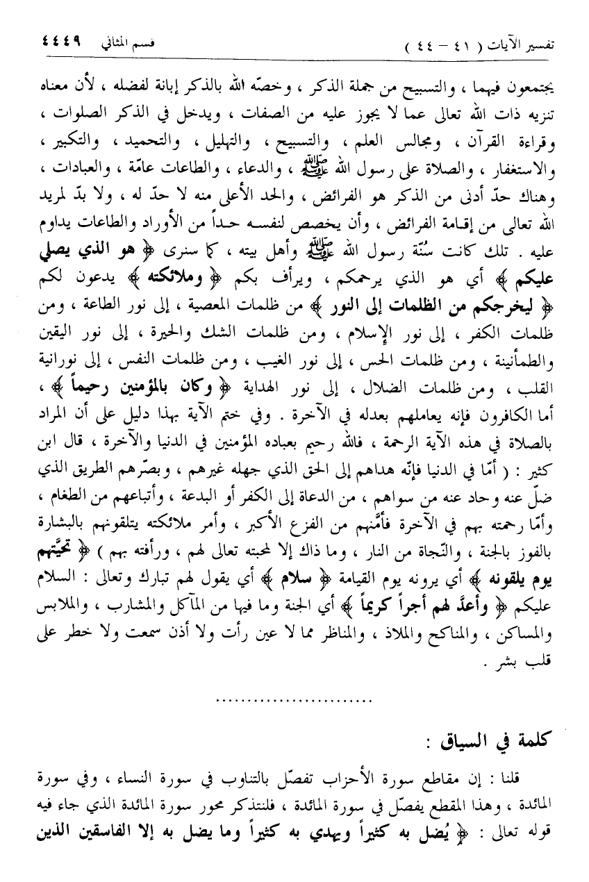 هُوَ الَّذِي يُصَلِّي عَلَيْكُمْ أي هو الذي يرحمكم، ويرأف بكم وَمَلائِكَتُهُ يدعون لكم لِيُخْرِجَكُمْ مِنَ الظُّلُماتِ إِلَى النُّورِ من ظلمات المعصية، إلى نور الطاعة، ومن ظلمات الكفر، إلى نور الإسلام، ومن ظلمات الشك والحيرة، إلى نور اليقين والطمأنينة، ومن ظلمات الحس، إلى نور الغيب، ومن ظلمات النفس، إلى نورانية القلب، ومن ظلمات الضلال، إلى نور الهداية وَكانَ بِالْمُؤْمِنِينَ رَحِيماً، أما الكافرون فإنه يعاملهم بعدله في الآخرة. وفي ختم الآية بهذا دليل على أن المراد بالصلاة في هذه الآية الرحمة، فالله رحيم بعباده المؤمنين في الدنيا والآخرة، قال ابن كثير: (أمّا في الدنيا فإنّه هداهم إلى الحق الذي جهله غيرهم، وبصّرهم الطريق الذي ضلّ عنه وحاد عنه من سواهم، من الدعاة إلى الكفر أو البدعة، وأتباعهم من الطغام، وأمّا رحمته بهم في الآخرة فأمّنهم من الفزع الأكبر، وأمر ملائكته يتلقونهم بالبشارة بالفوز بالجنة، والنّجاة من النار، وما ذاك إلا لمحبته تعالى لهم، ورأفته بهم)